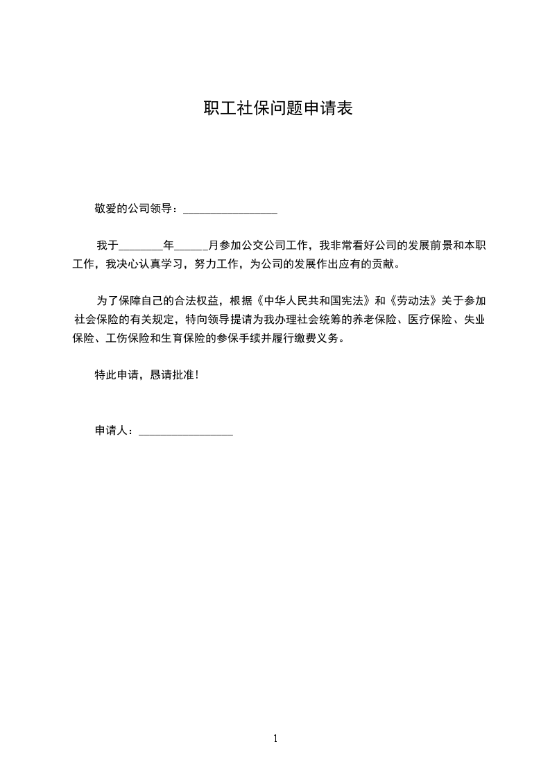 为了保障自己的合法权益,根据《中华人民共和国宪法》和《劳动法》关于参加社会保险的有关规定,特向领导提请为我办理社会统筹的养老保险、医疗保险、失业保险、工伤保险和生育保险的参保手续并履行缴费义务。