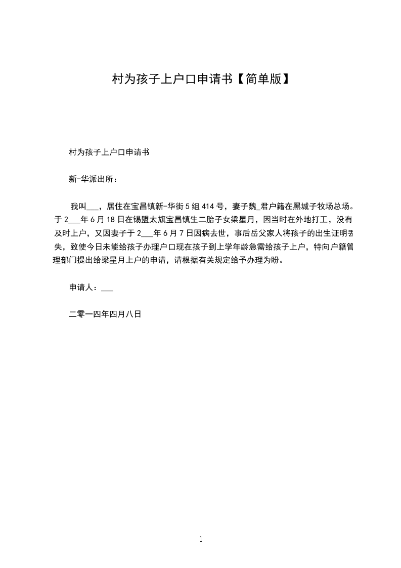 本人叫_________(身份证:________________________),女,________年___月_____日生于_______,户口在_____________,于_________年____月____日与(身份证:___________________________)初婚,并于______年____月____日在___________人民医院生一儿子/女儿,名为___________。当时因身体原因/没有办理准生证,没有及时为小孩上户口,现特申请贵所办理_________的落户手续,请予以批准。