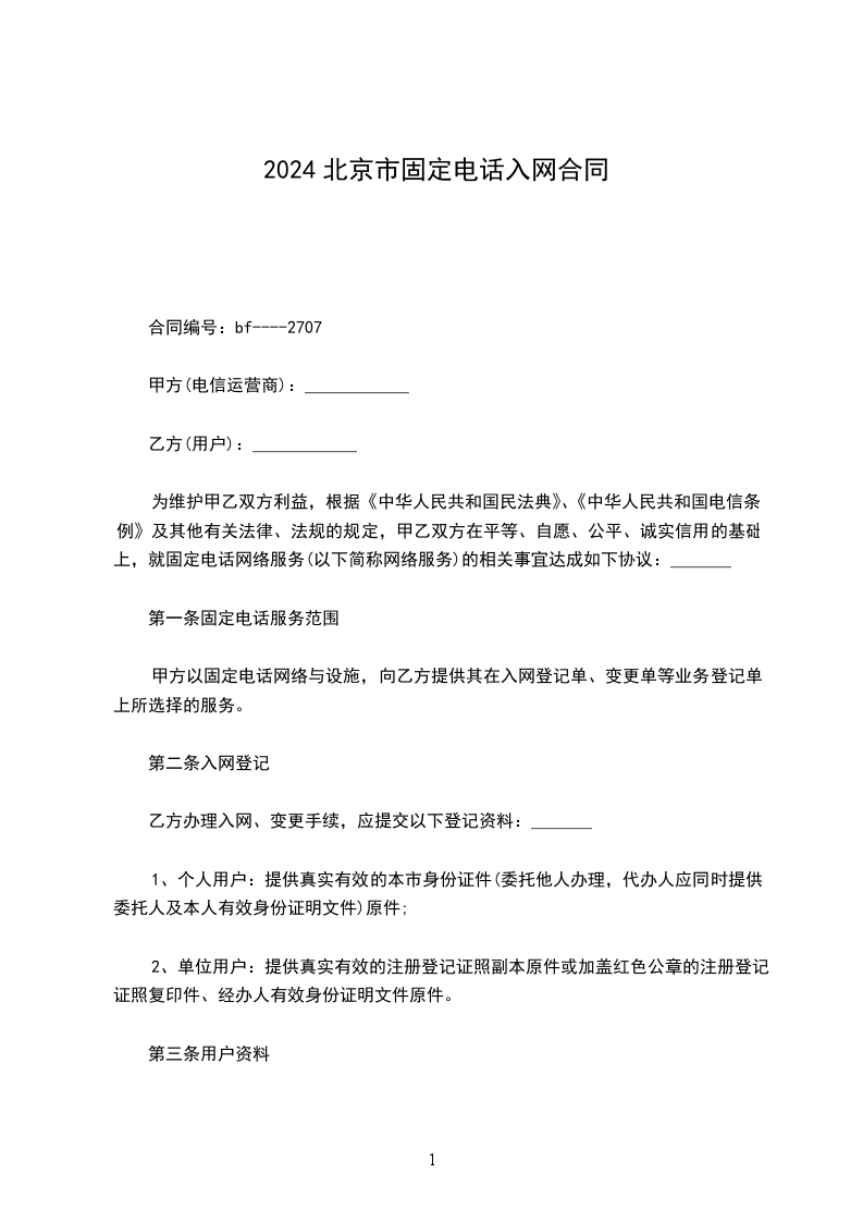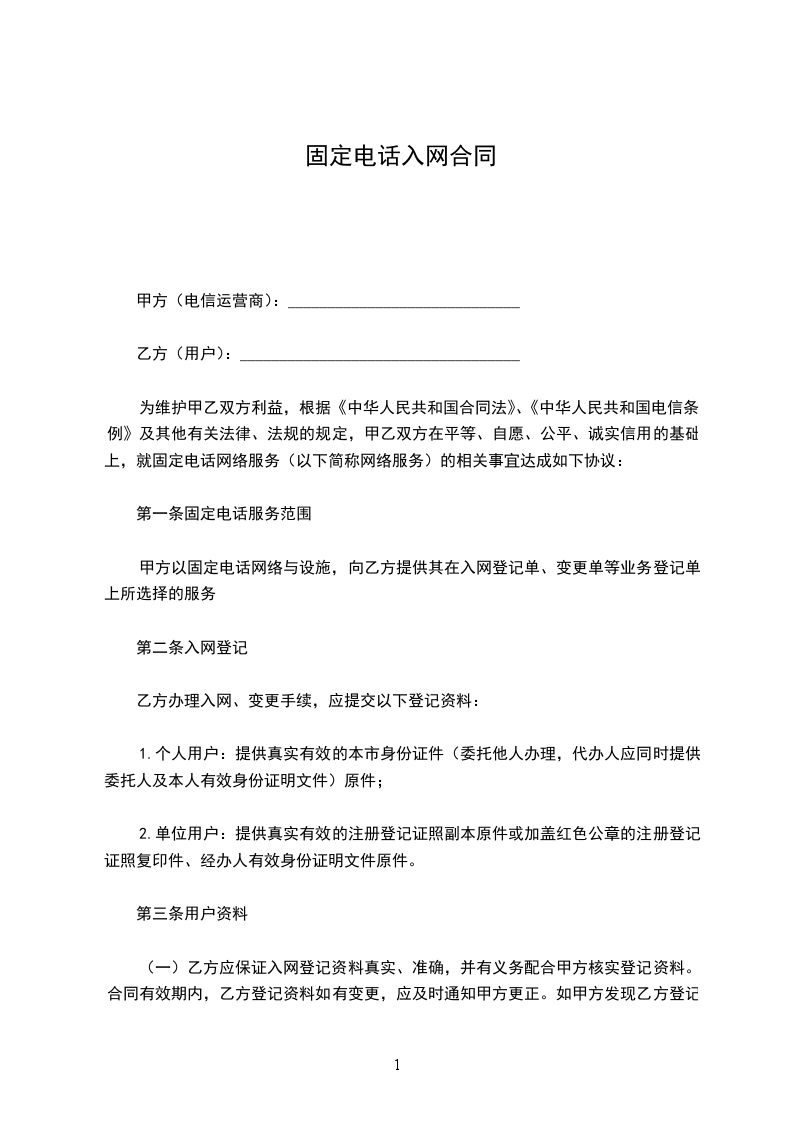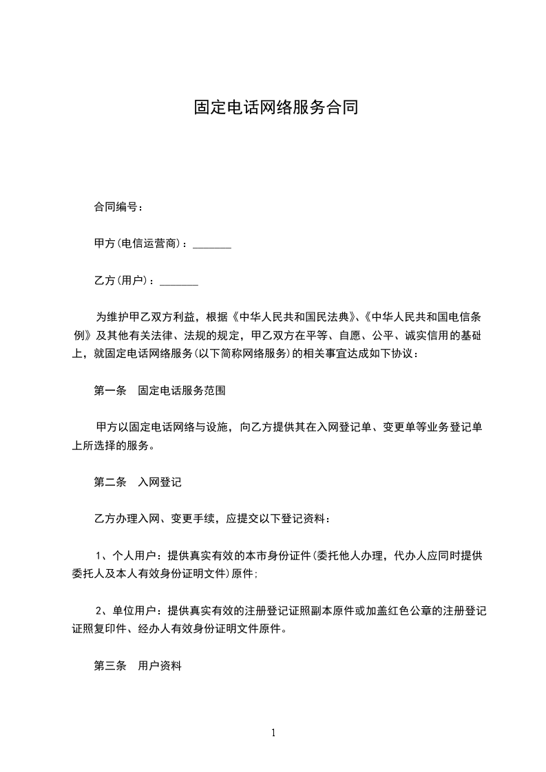 为维护甲乙双方利益,根据《中华人民共和国民法典》、《中华人民共和国电信条例》及其他有关法律、法规的规定,甲乙双方在平等、自愿、公平、诚实信用的基础上,就固定电话网络服务(以下简称网络服务)的相关事宜达成如下协议: