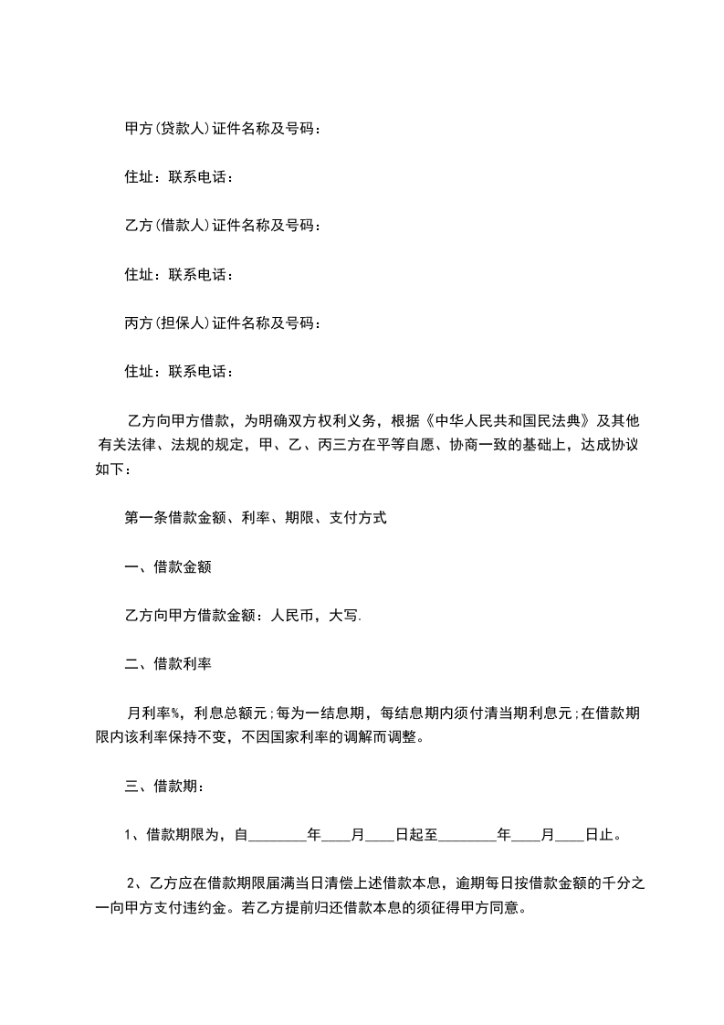 乙方向甲方借款,为明确双方权利义务,根据《中华人民共和国民法典》及其他有关法律、法规的规定,甲、乙、丙三方在平等自愿、协商一致的基础上,达成协议如下: