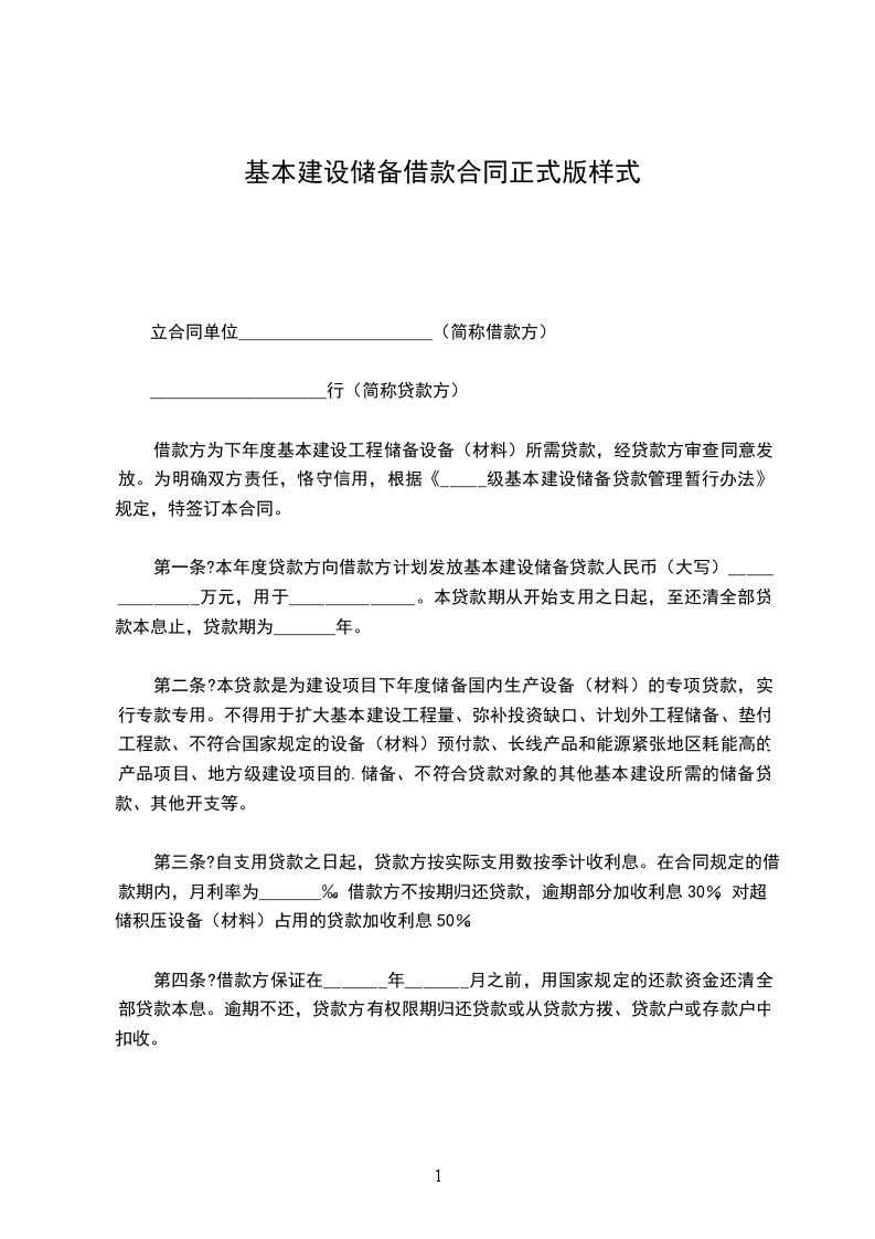 第一条?本年度贷款方向借款方计划发放基本建设储备贷款人民币(大写)______________万元,用于______________。本贷款期从开始支用之日起,至还清全部贷款本息止,贷款期为_______年。