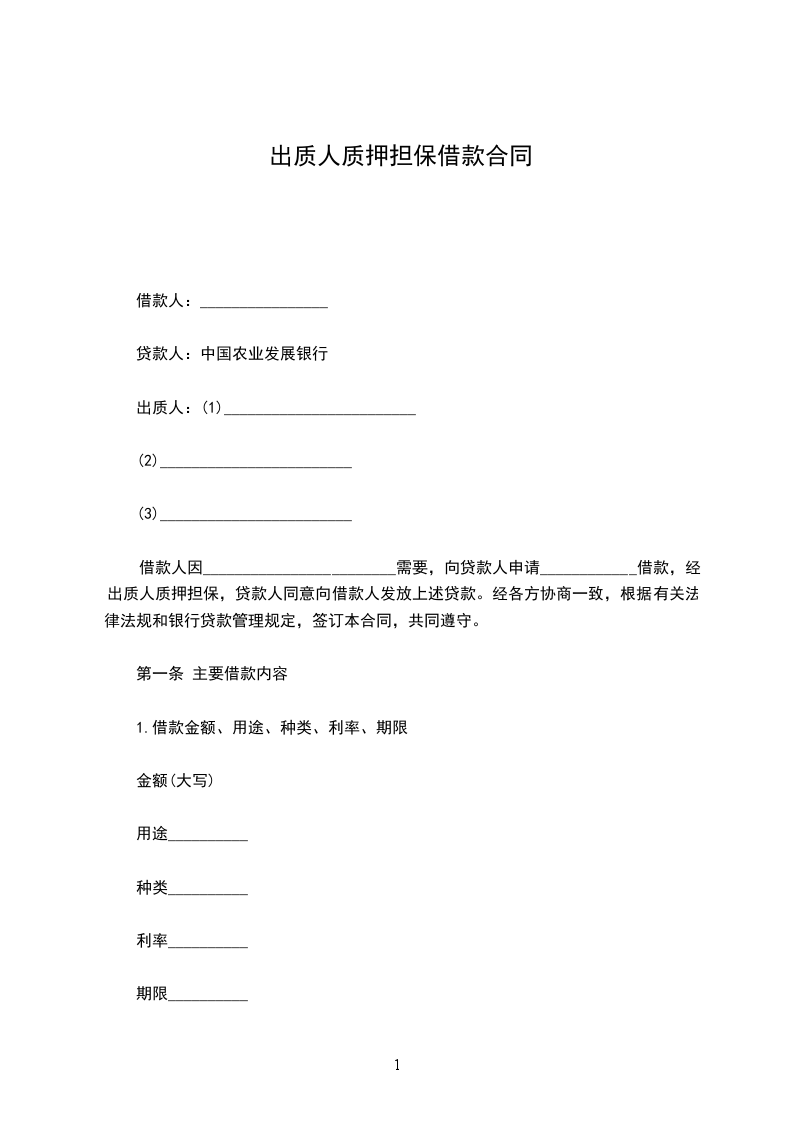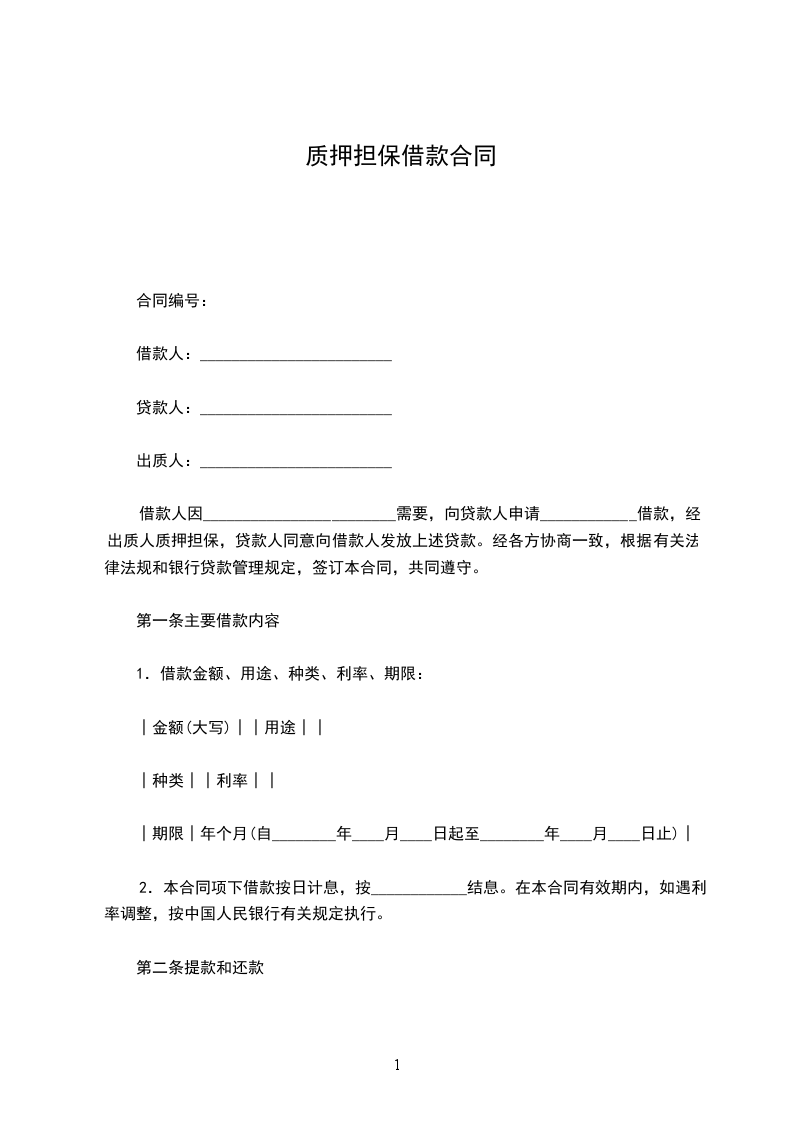 借款人因________________________需要,向贷款人申请____________借款,经出质人质押担保,贷款人同意向借款人发放上述贷款。经各方协商一致,根据有关法律法规和银行贷款管理规定,签订本合同,共同遵守。