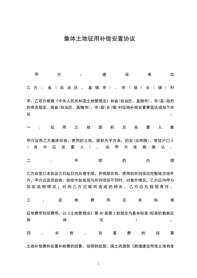 甲、乙双方根据《中华人民共和国土地管理法》和省(自治区、直辖市)、市(县)政府的有关规定,就省(自治区、直辖市)、市(县)乡(镇)村征地补偿安置事宜达成如下协议: