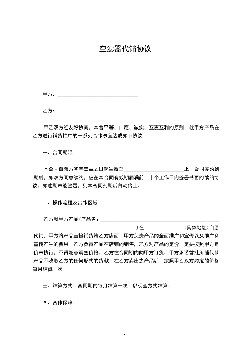 乙方就甲方产品(产品名:________________________________________________________________________________________)在________________(具体地址)自愿代销,甲方将产品直接铺货给乙方店面,甲方负责产品的全面推广和宣传以及推广和宣传产生的费用。乙方负责产品在店铺的销售,乙方对产品的定价一定要按照甲方定价来执行,不得随意调整价格。乙方在合同期内向甲方订货,甲方承诺首批所铺代销产品不收取乙方的任何形式的货款。在乙方卖出去产品后,按照甲乙双方约定的价格每月结算一次。