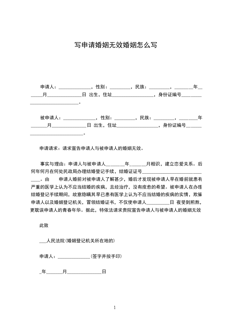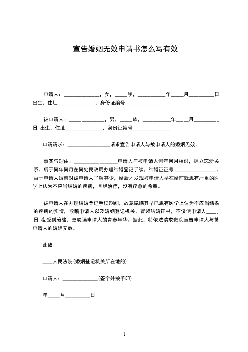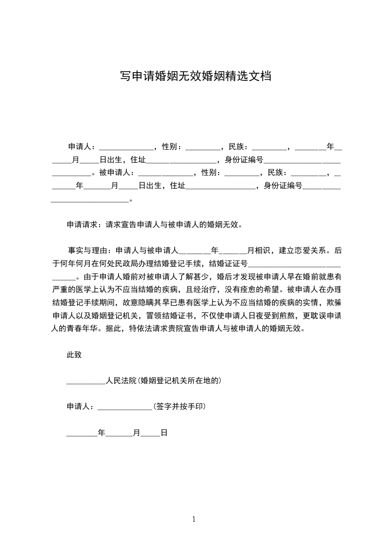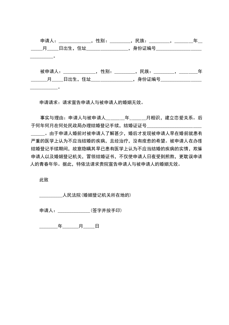 事实与理由:申请人与被申请人________年_______月相识,建立恋爱关系。后于何年何月在何处民政局办理结婚登记手续,结婚证证号______________________________。由于申请人婚前对被申请人了解甚少,婚后才发现被申请人早在婚前就患有严重的医学上认为不应当结婚的疾病,且经治疗,没有痊愈的希望。被申请人在办理结婚登记手续期间,故意隐瞒其早已患有医学上认为不应当结婚的疾病的实情,欺骗申请人以及婚姻登记机关,冒领结婚证书,不仅使申请人日夜受到煎熬,更耽误申请人的青春年华。据此,特依法请求贵院宣告申请人与被申请人的婚姻无效。