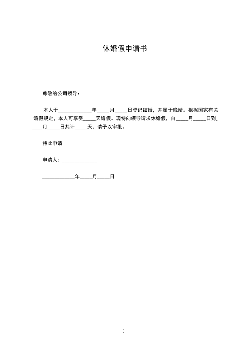 本人于_____________年_____月_____日登记结婚,并属于晚婚。根据国家有关婚假规定,本人可享受_____天婚假。现特向领导请求休婚假,自_____月_____日到_____月_____日共计_____天,请予以审批。