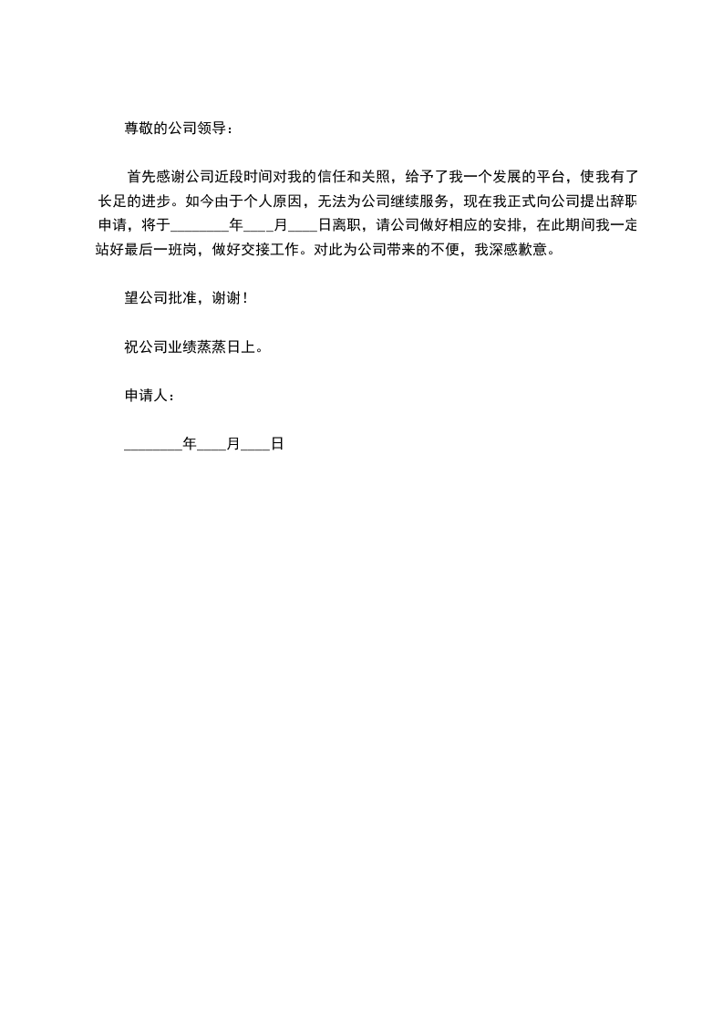 望领导批准我的申请,并请协助办理相关离职手续,在正式离开之前我将认真继续做好目前的每一项工作。衷心祝愿公司健康成长,事业蒸蒸日上!祝愿各位领导与同事:健康快乐,平安幸福!