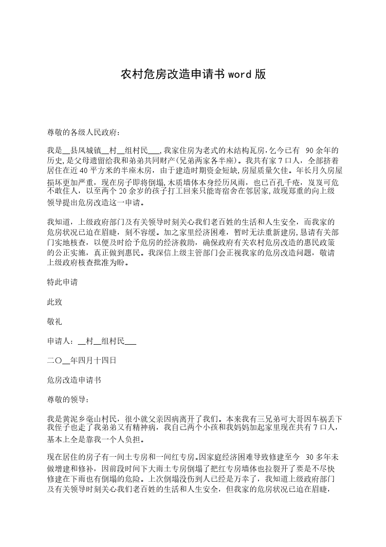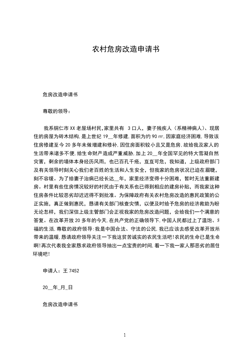 尊敬的各位领导你们好!我叫_______________,是__________乡__________村__________组_______________自然村的贫困农民,今年__________岁,老伴名叫_______________,年龄_______________岁。我们家现住的瓦房建造于1982年,距今已经31年了,因为当时条件所限,房子墙体全部用土坯建造,没有钱用砖砌,经历了多年的风吹雨打,墙体腐蚀十分严重,房顶多处开裂,虽经多次维修过,但是不能解决根本问题,每逢降雨,屋内漏的厉害,夜晚下雨更是无法休息,整夜抗灾防汛,而且唯恐房子坍塌,乡村两级领导先后多次亲自深入到我家查看险房,并要求尽快翻盖新房,消除危险,防患于未然。同时,由于我们夫妇俩人年事已高,身体毛病多,需要常年吃药,日常花销非常大,经济状况也一直不好。在此,通过乡村两级领导一再关爱,我们决定准备进行危房改造,改善基本的住房条件,以免再让乡村领导在百忙中过多操心我们家的住房安全问题,因为资金缺口还比较大,特申请给予农村危房改造补助。