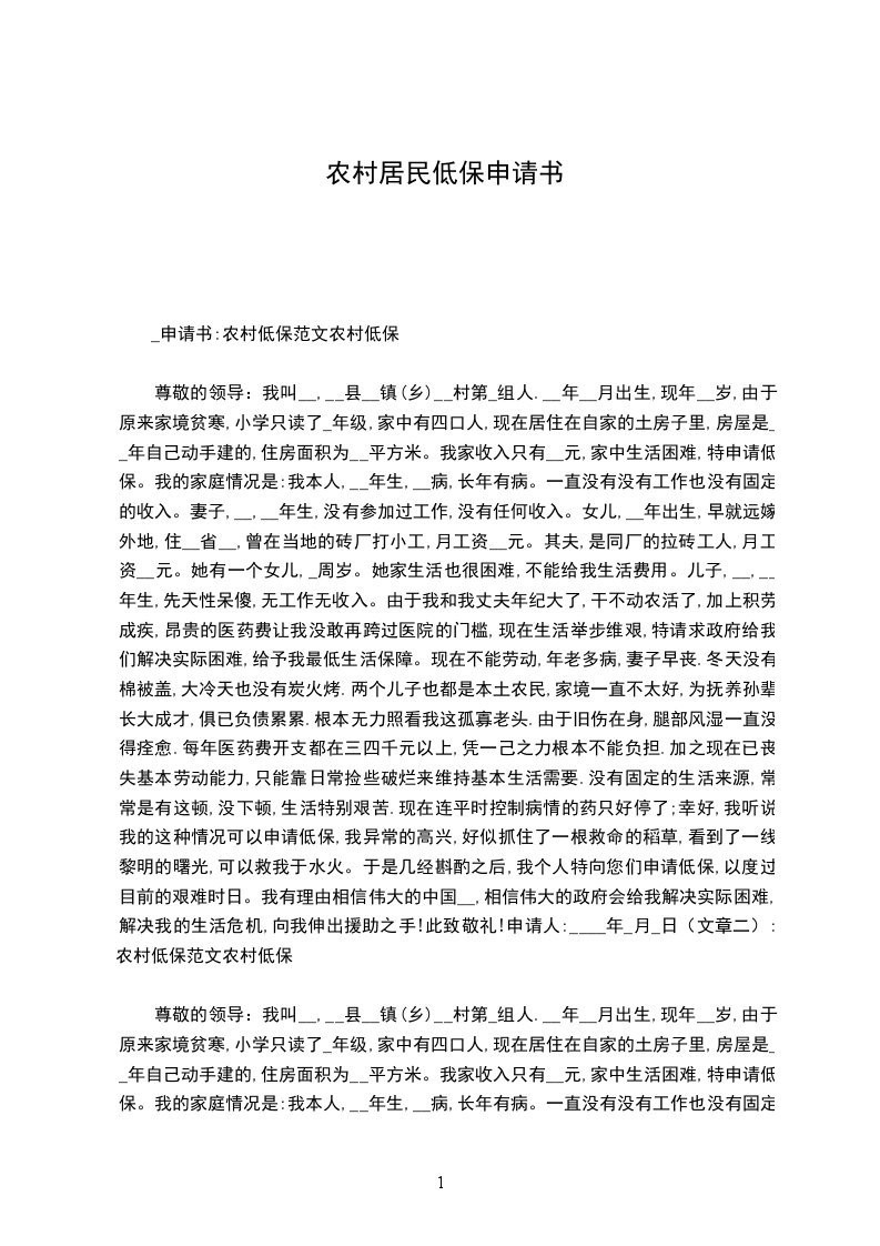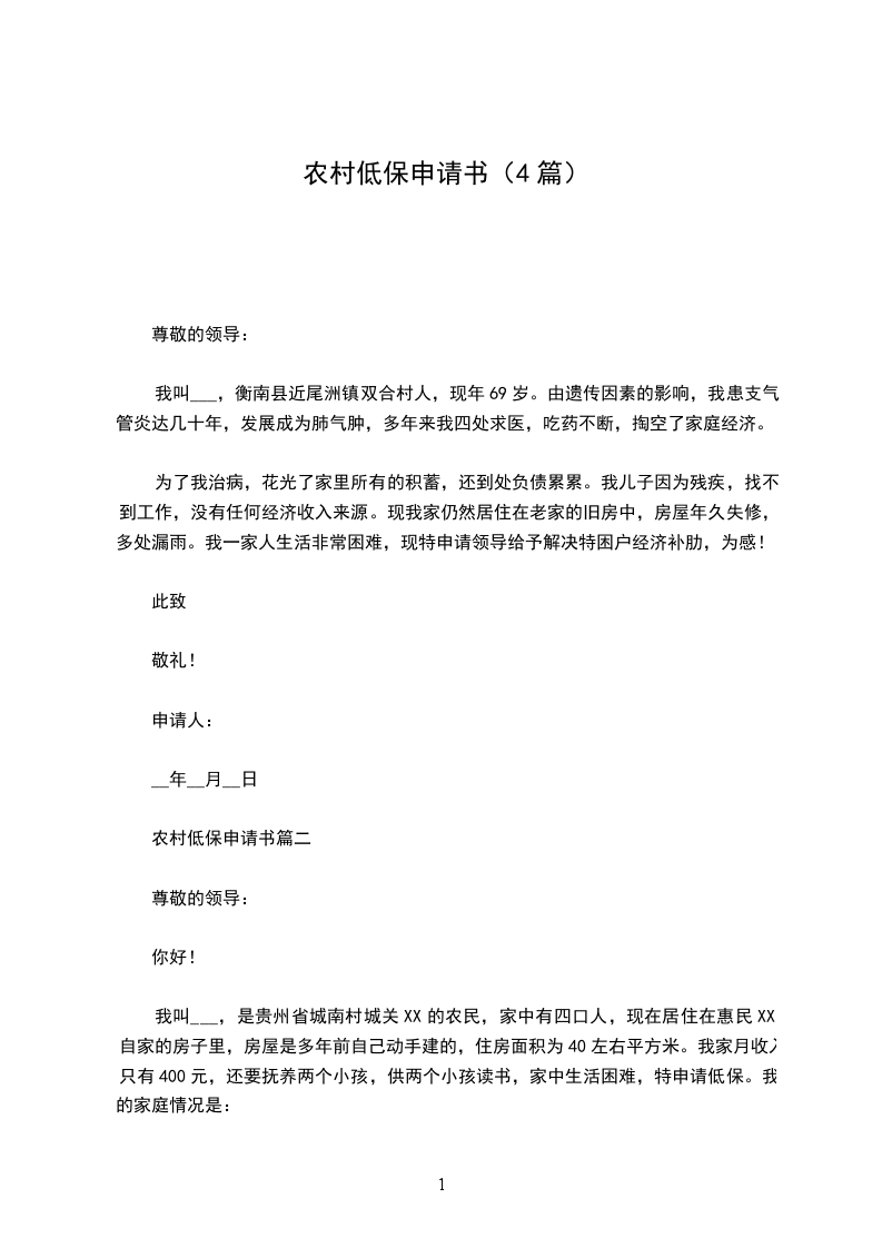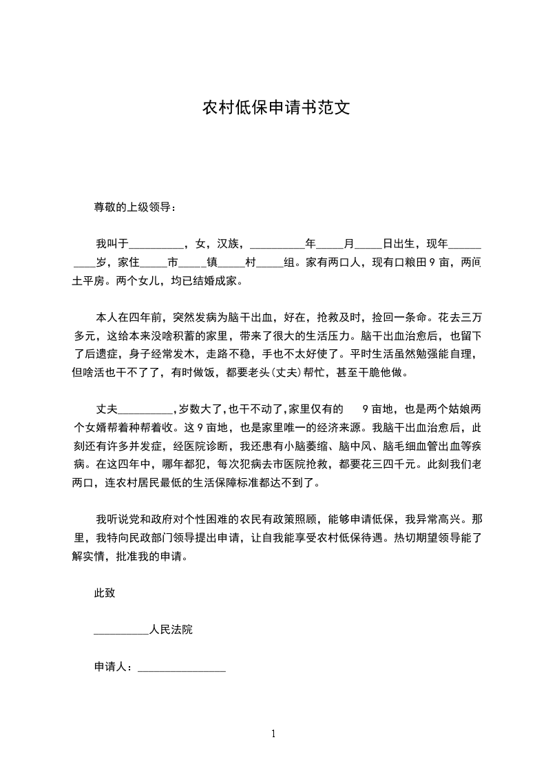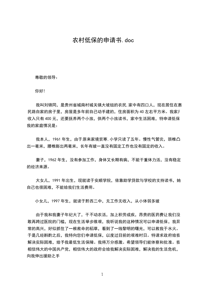 我听说党和政府对个性困难的农民有政策照顾,能够申请低保,我异常高兴。那里,我特向民政部门领导提出申请,让自我能享受农村低保待遇。热切期望领导能了解实情,批准我的申请。