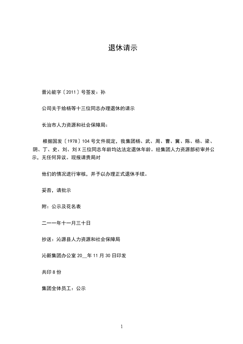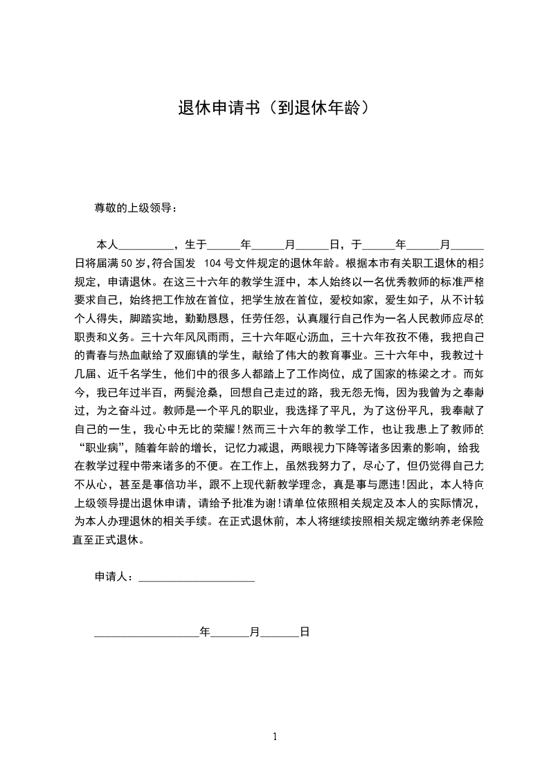 本人_______________,生于__________年__________月__________日,于_____________年__________月__________日将届满__________岁,符合国发(1978)104号文件规定的退休年龄。根据本市有关职工退休的相关规定,申请退休。请单位依照相关规定及本人的实际情况,为本人办理退休的相关手续。在正式退休前,本人将继续按照相关规定缴纳养老保险,直至正式退休。