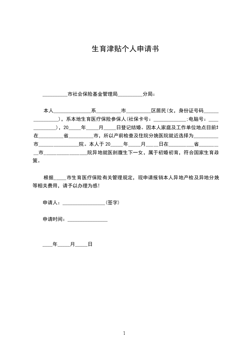 本人_______________系__________市__________区居民(女,身份证号码________________),系本地生育医疗保险参保人(社保卡号:_____________;电脑号:_____________),20_____年_____月_____日登记结婚。因本人家庭及工作单位地点目前均在__________省__________市,所以产前检查及住院分娩医院就近选择为__________市________________院。本人于20_____年_____月_____日在__________省__________市_________________院异地就医剖腹生下一女,属于初婚初育,符合国家生育政策。