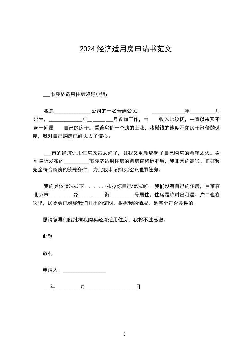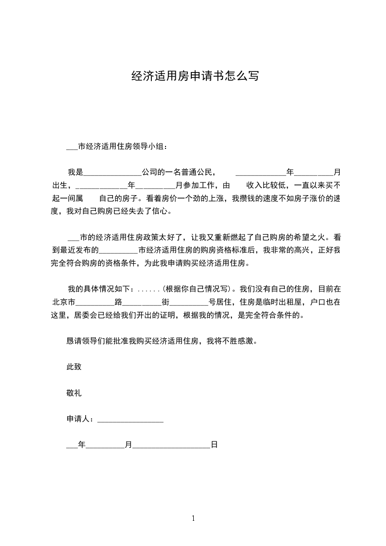__________市的经济适用住房政策太好了,让我又重新燃起了自己购房的希望之火。看到最近发布的__________市经济适用住房的购房资格标准后,我非常的高兴,正好我完全符合购房的资格条件,为此我申请购买经济适用住房。