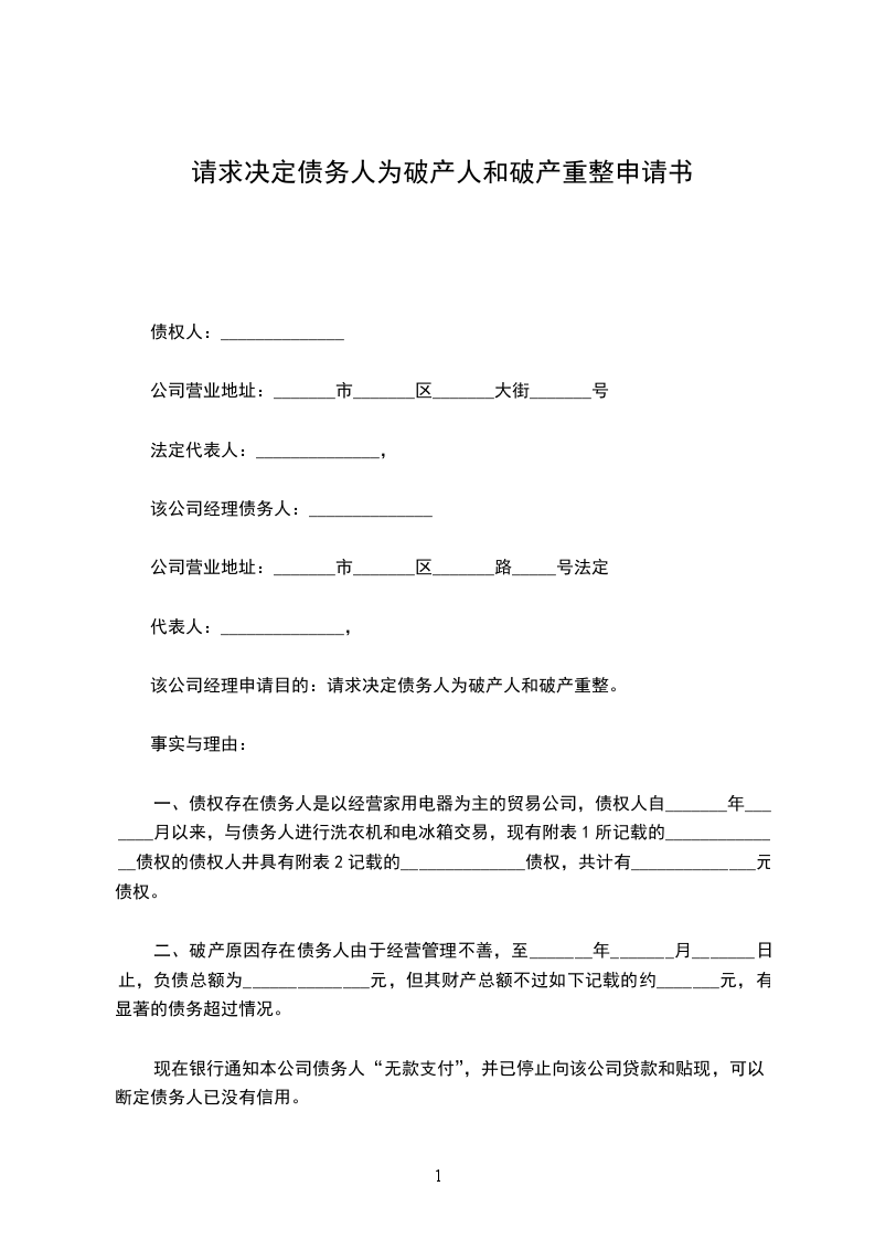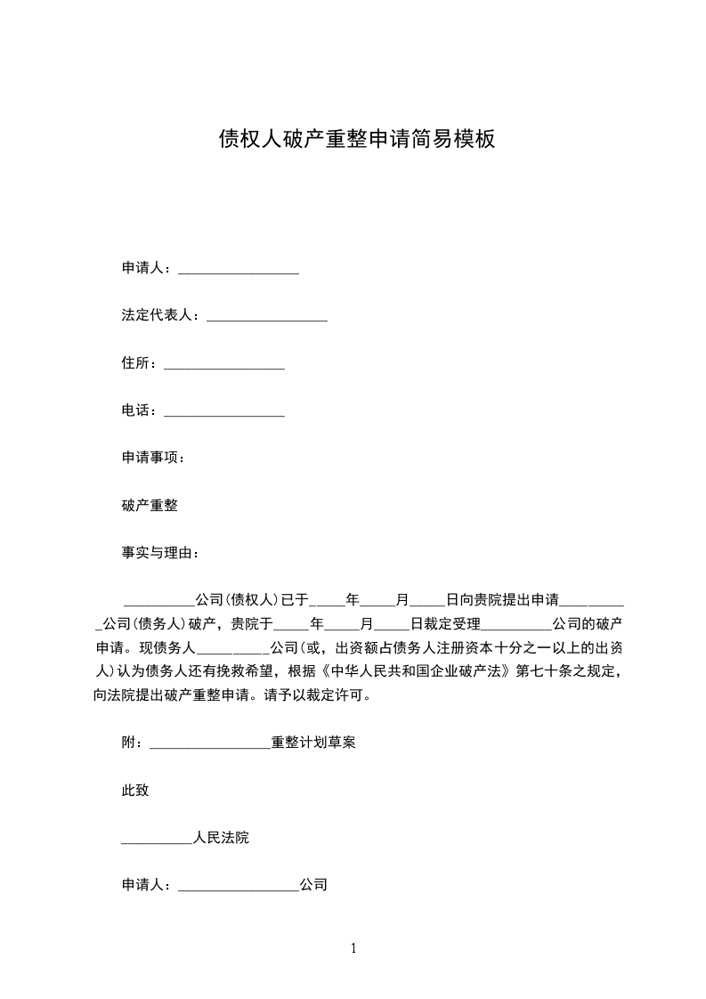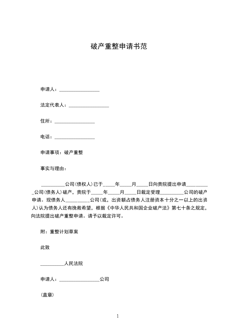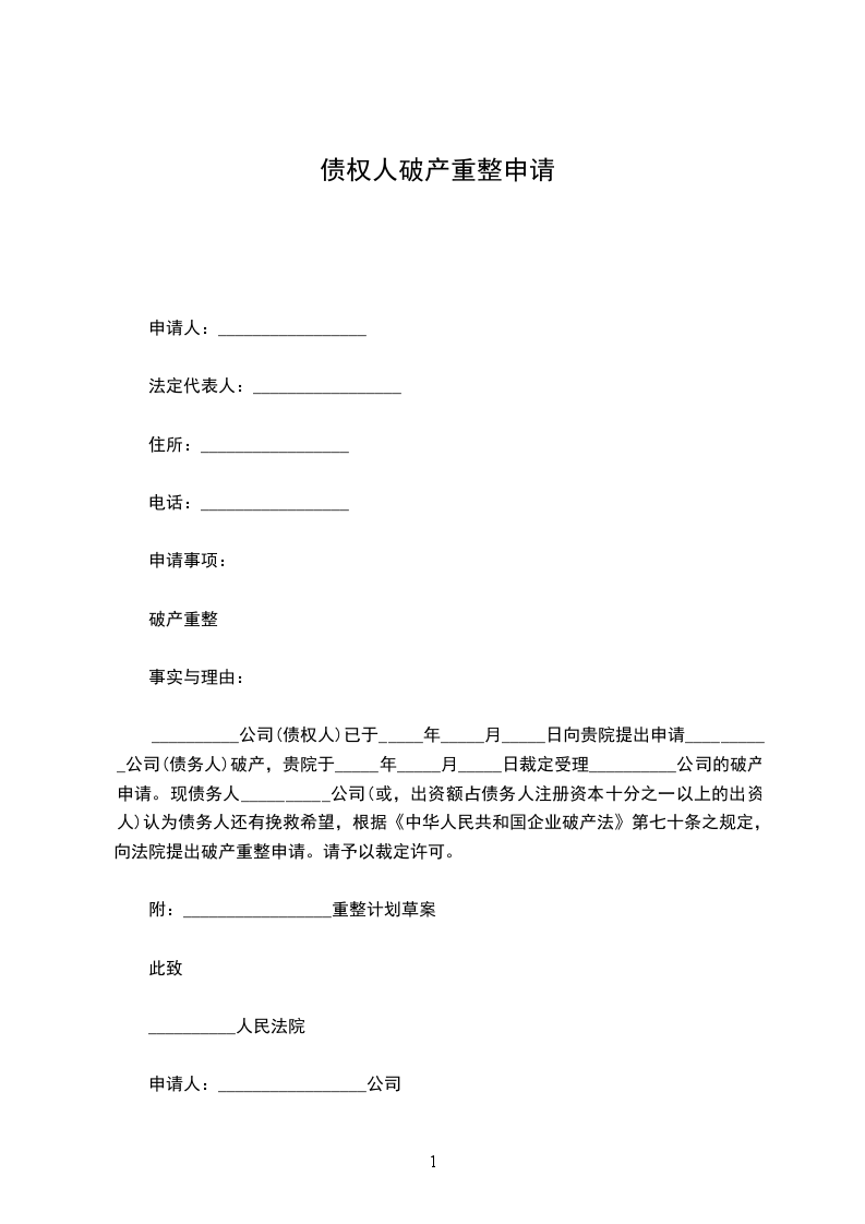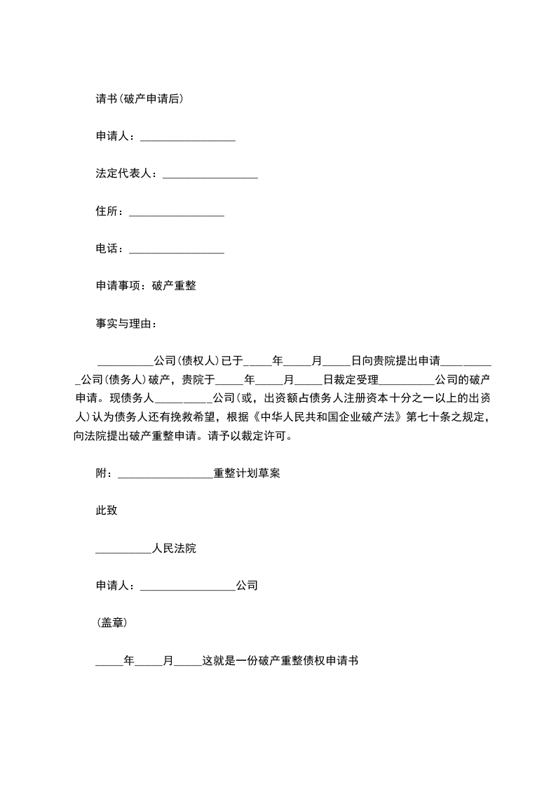 债务人提交破产重整申请书格式