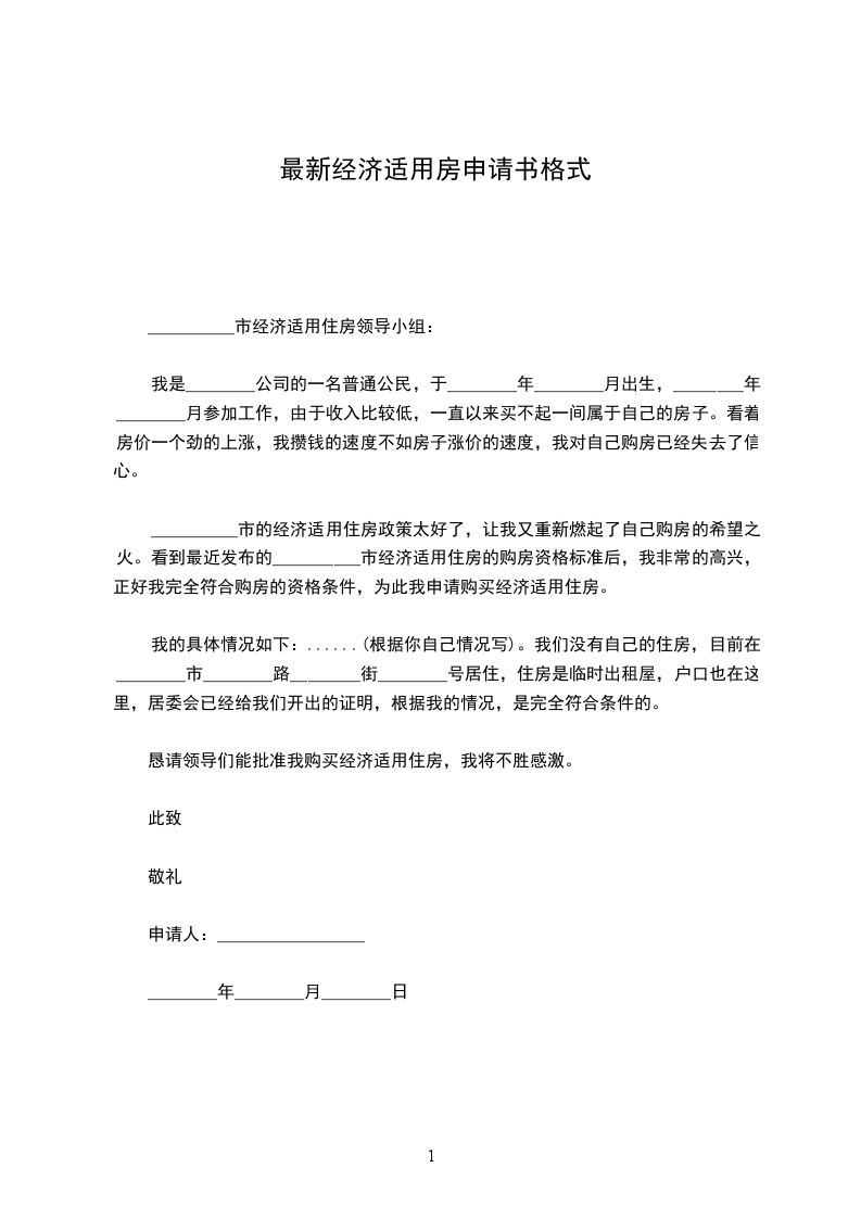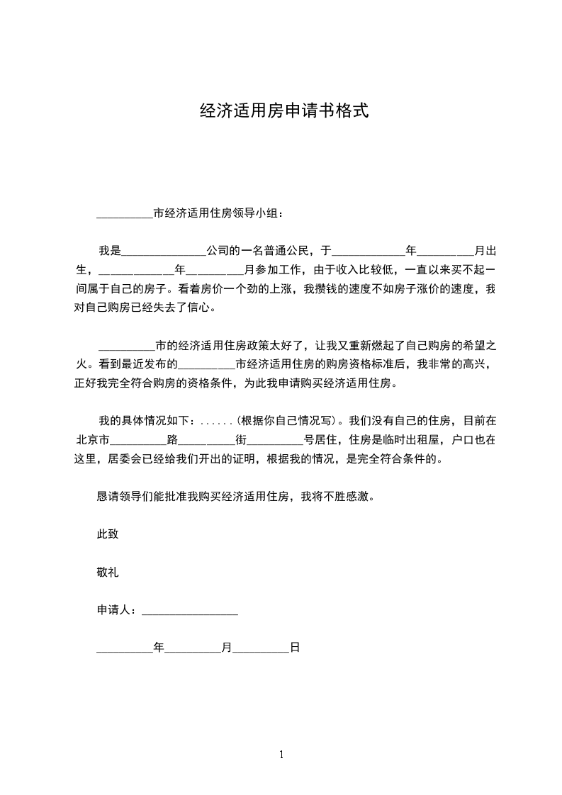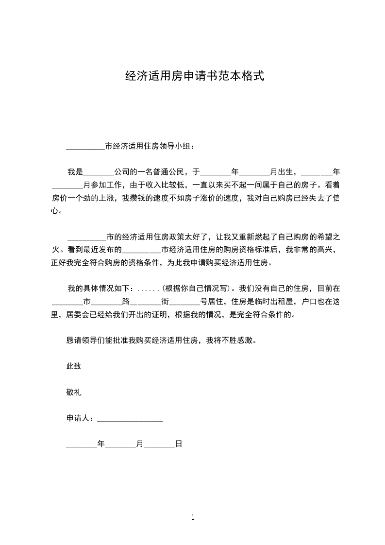 __________市的经济适用住房政策太好了,让我又重新燃起了自己购房的希望之火。看到最近发布的__________市经济适用住房的购房资格标准后,我非常的高兴,正好我完全符合购房的资格条件,为此我申请购买经济适用住房。