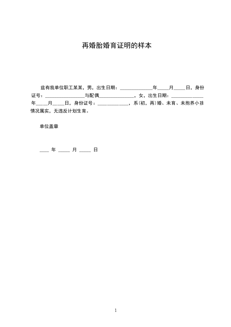 兹有我单位职工某某,男,出生日期:______________年_____月_____日,身份证号:_________________与配偶_______________,女,出生日期:______________年_____月_____日,身份证号:_____________,系(初,再)婚、未育、未抱养小孩情况属实,无违反计划生育。