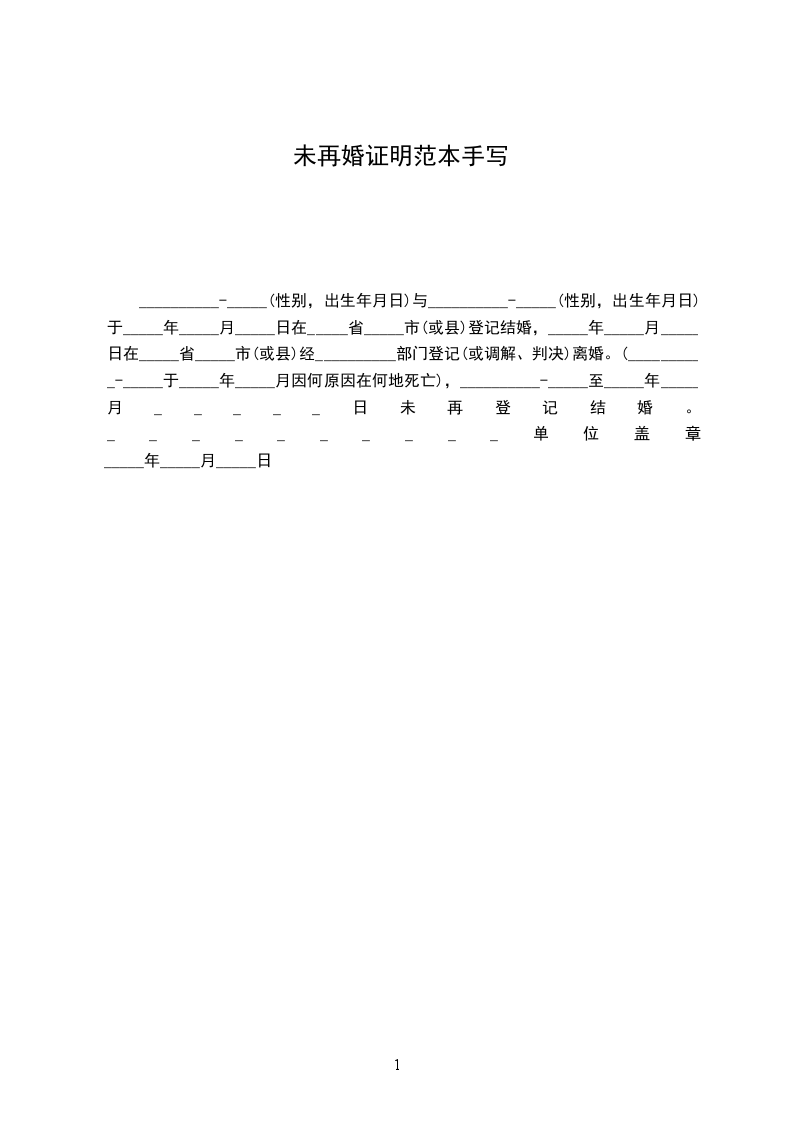 __________-_____(性别,出生______年____月____日)与__________-_____(性别,出生______年____月____日)于_____年_____月_____日在_____省_____市(或县)登记结婚,_____年_____月_____日在_____省_____市(或县)经__________部门登记(或调解、判决)离婚。(__________-_____于_____年_____月因何原因在何地死亡),__________-_____至_____年_____月_____日未再登记结婚。