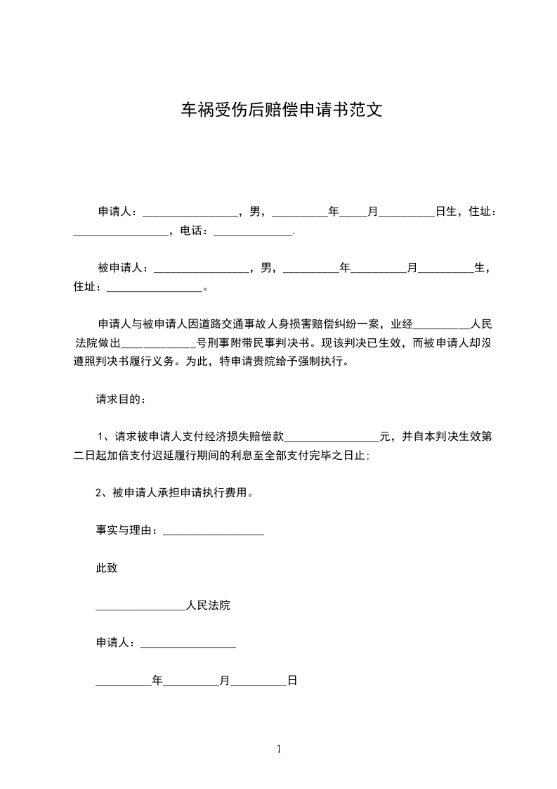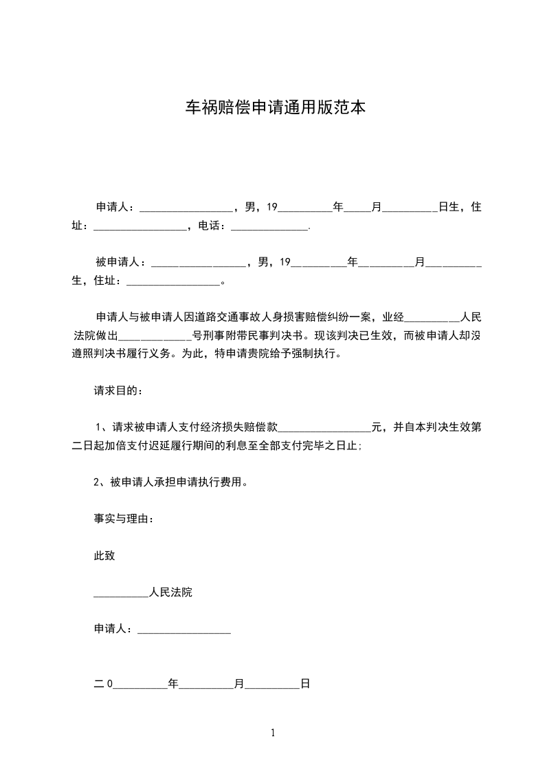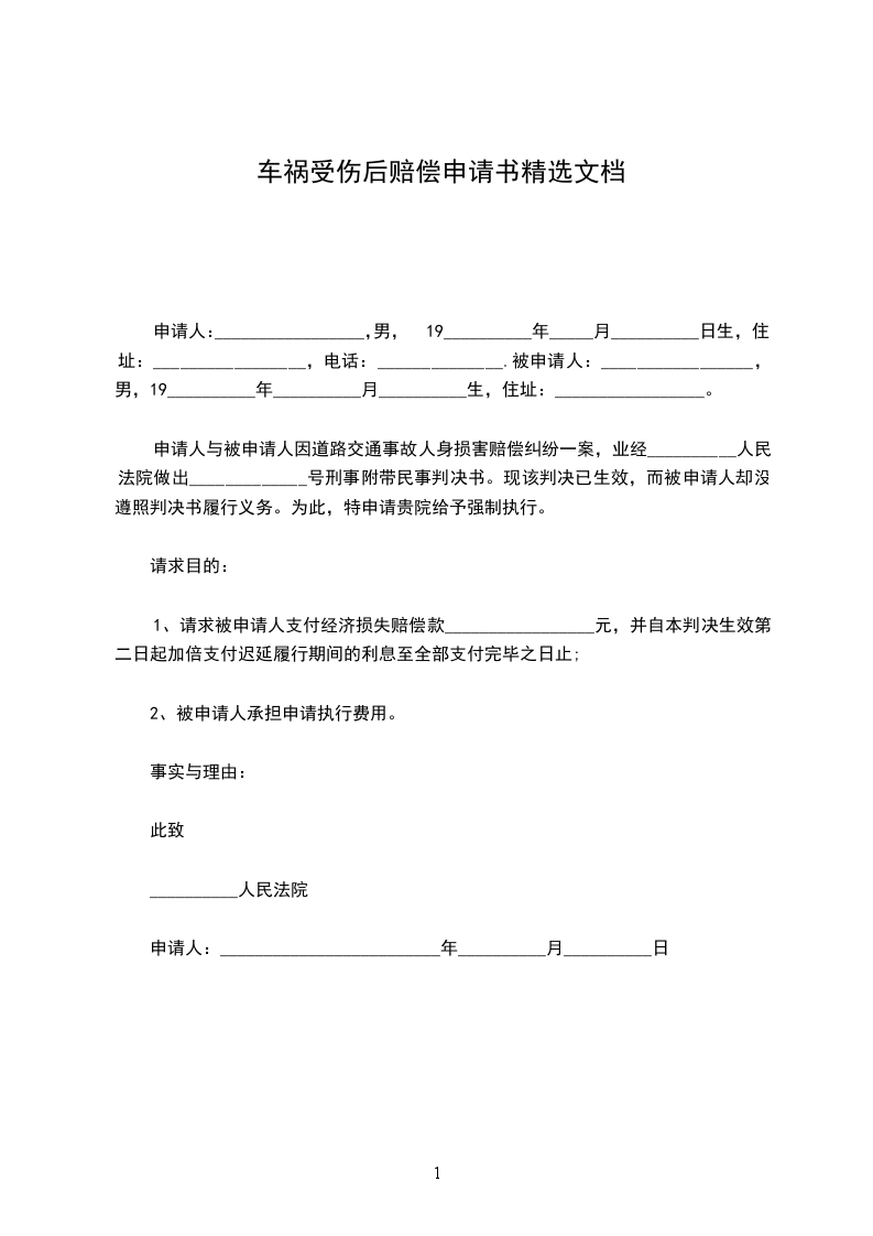 申请人与被申请人因道路交通事故人身损害赔偿纠纷一案,业经__________人民法院做出_____________号刑事附带民事判决书。现该判决已生效,而被申请人却没遵照判决书履行义务。为此,特申请贵院给予强制执行。
