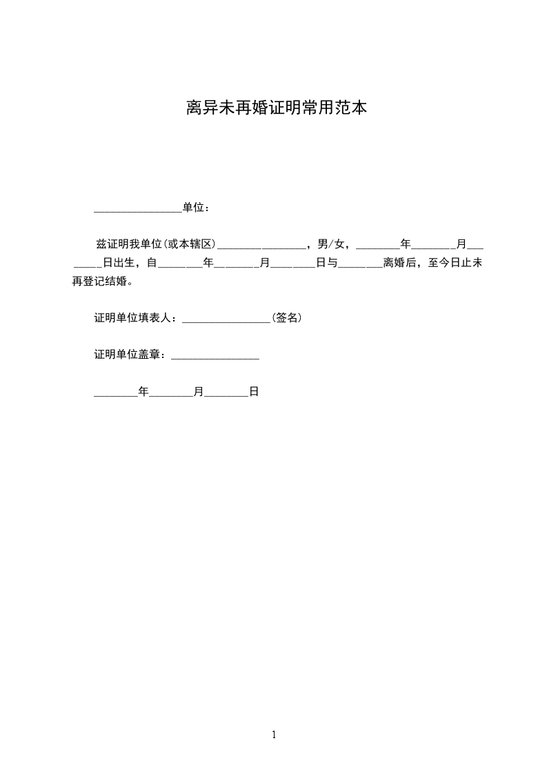 兹证明我单位(或本辖区)_____________,男/女_____,_____________年__________月__________日出生,自_____________年__________月__________日与_____________离婚后,至今日止(或至_____________年__________月__________日离境之日止)未再登记结婚。