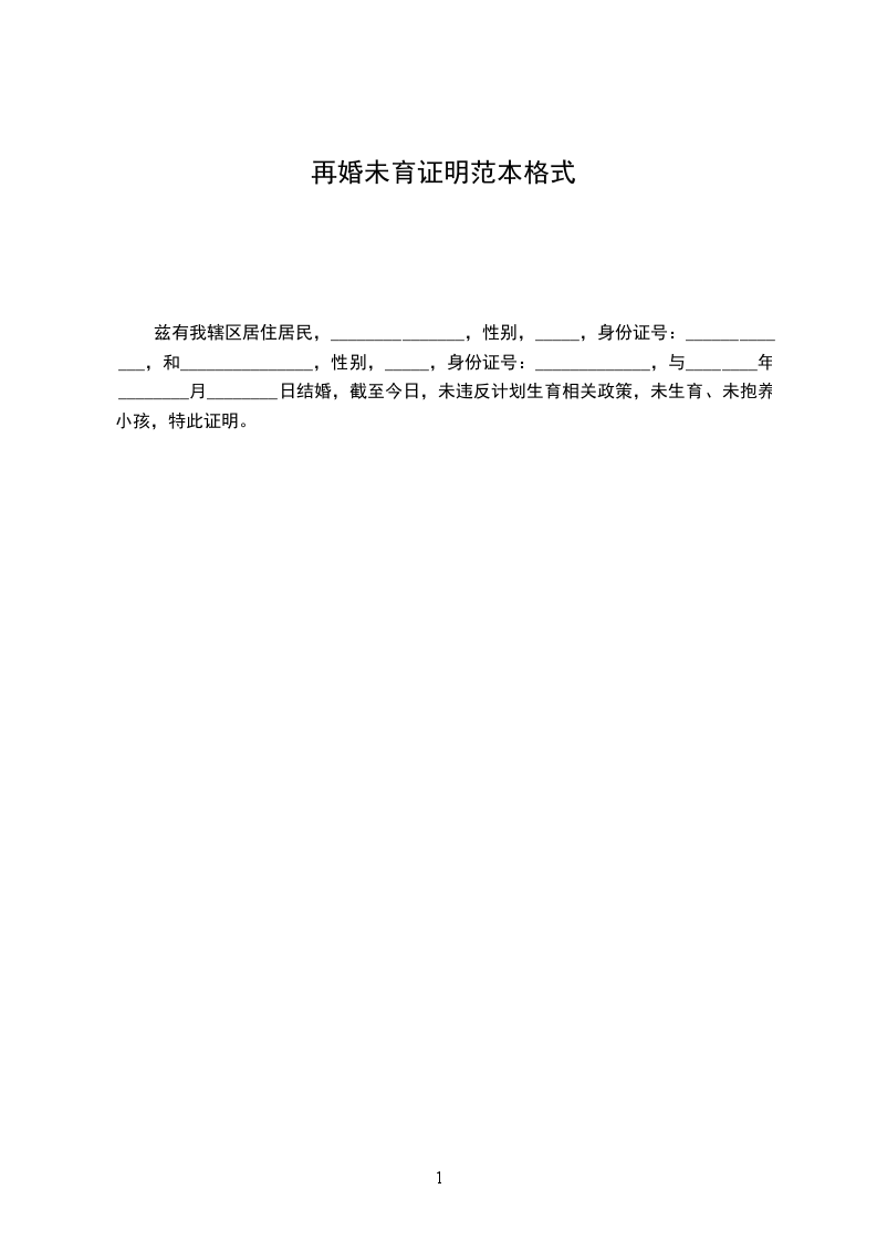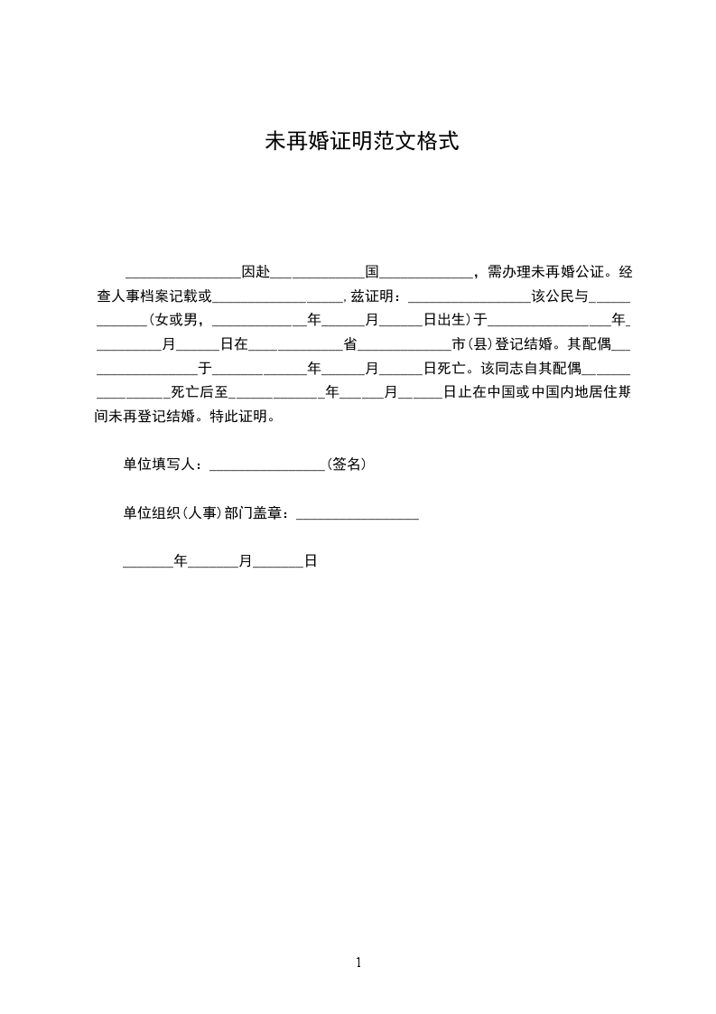 ________________因赴_____________国_____________,需办理未再婚公证。经查人事档案记载或__________________,兹证明:_________________该公民与_____________(女或男,_____________年______月______日出生)于_________________年__________月______日在_____________省_____________市(县)登记结婚。其配偶_________________于_____________年______月______日死亡。该同志自其配偶_________________死亡后至_____________年______月______日止在中国或中国内地居住期间未再登记结婚。特此证明。