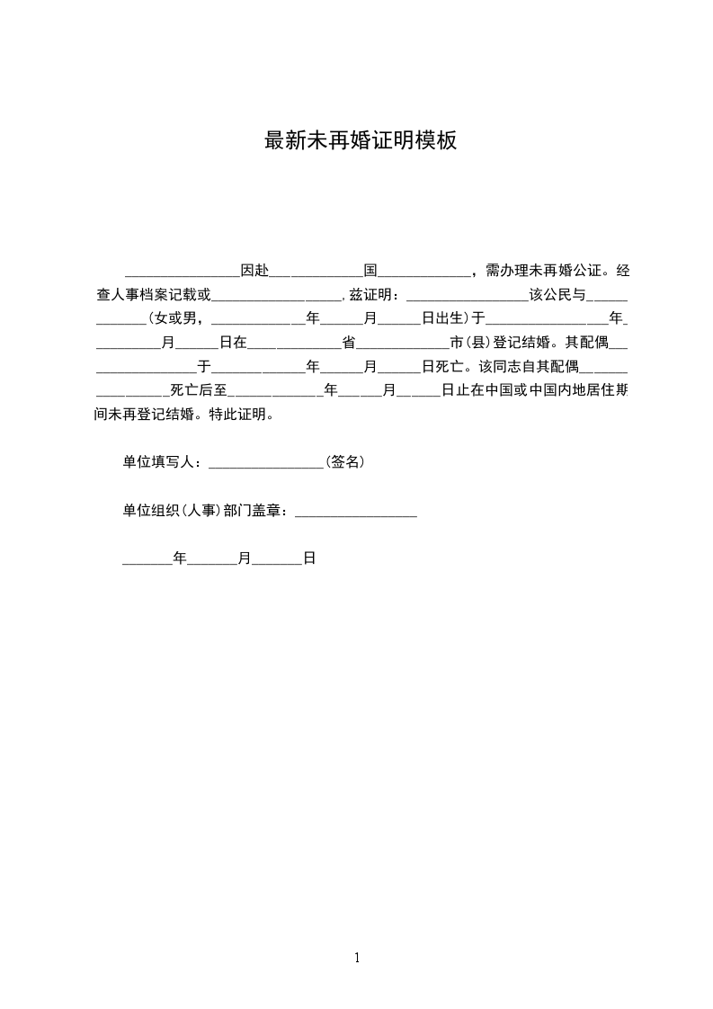________________因赴_____________国_____________,需办理未再婚公证。经查人事档案记载或__________________,兹证明:_________________该公民与_____________(女或男,_____________年______月______日出生)于_________________年__________月______日在_____________省_____________市(县)登记结婚。其配偶_________________于_____________年______月______日死亡。该同志自其配偶_________________死亡后至_____________年______月______日止在中国或中国内地居住期间未再登记结婚。特此证明。