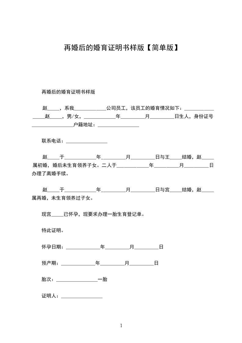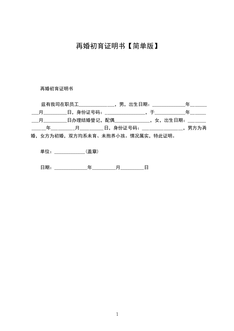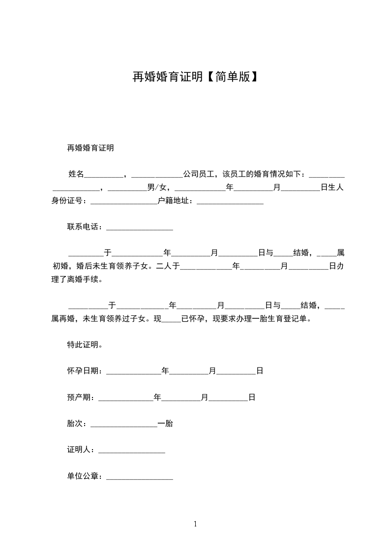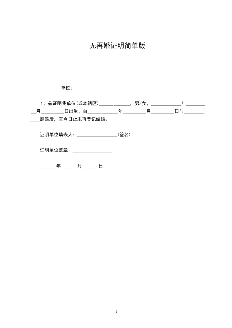 1、兹证明我单位(或本辖区)_____________,男/女,_____________年__________月__________日出生,自_____________年__________月__________日与_____________离婚后,至今日止未再登记结婚。