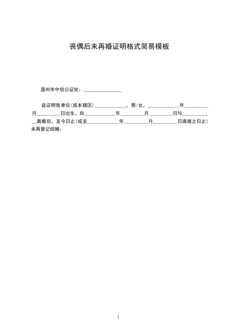 兹证明我单位(或本辖区)_____________,男/女,_____________年__________月__________日出生,自_____________年__________月__________日与_____________离婚后,至今日止(或至_____________年__________月__________日离境之日止)未再登记结婚。