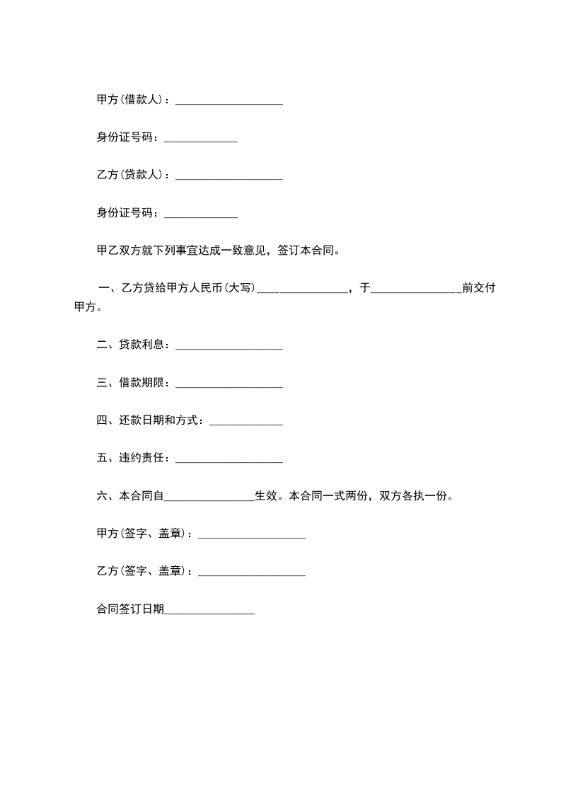 一、乙方贷给甲方人民币(大写)________________,于________________前交付甲方。