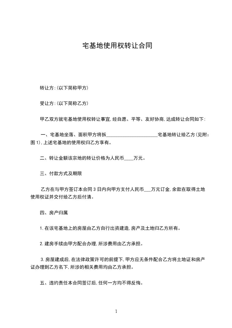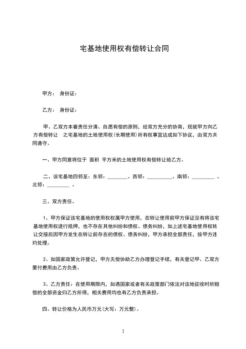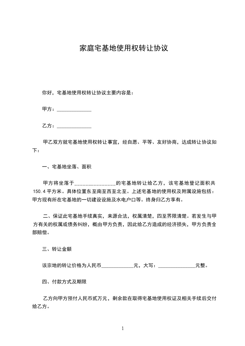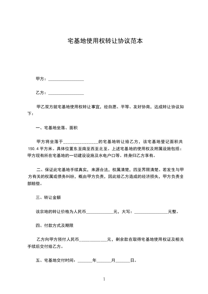 甲方将坐落于_______________的宅基地转让给乙方,该宅基地登记面积共150.4平方米。具体位置东至南至西至北至。上述宅基地的使用权及附属设施包括:甲方现有所在宅基地的一切建设设施及水电户口等。终身归乙方享有。