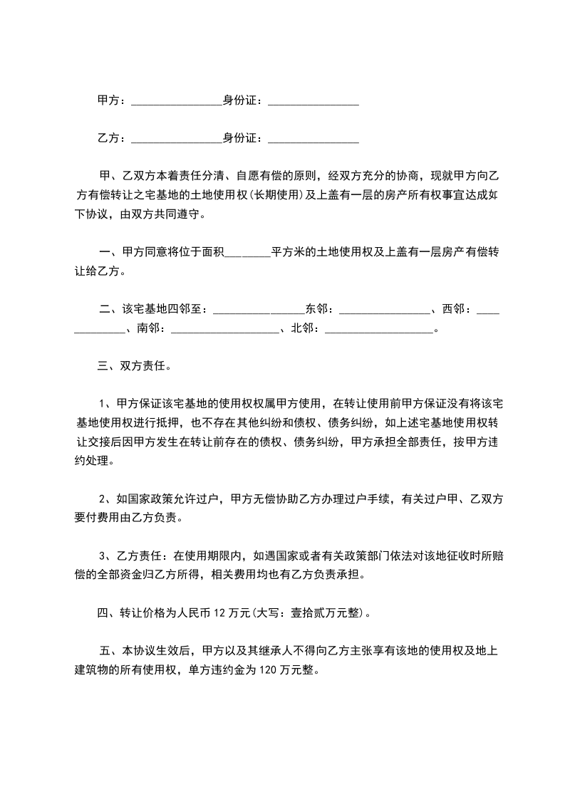 七、在法律政策许可的前提下,甲方应无条件配合乙方将宅基地使用证和相关手续办理到乙方名下,所涉的相关费用均由乙方承担。甲方违反本协议导致宅基地不能过户或无故进行交付,甲方应支付给乙方违约金壹拾贰万元。