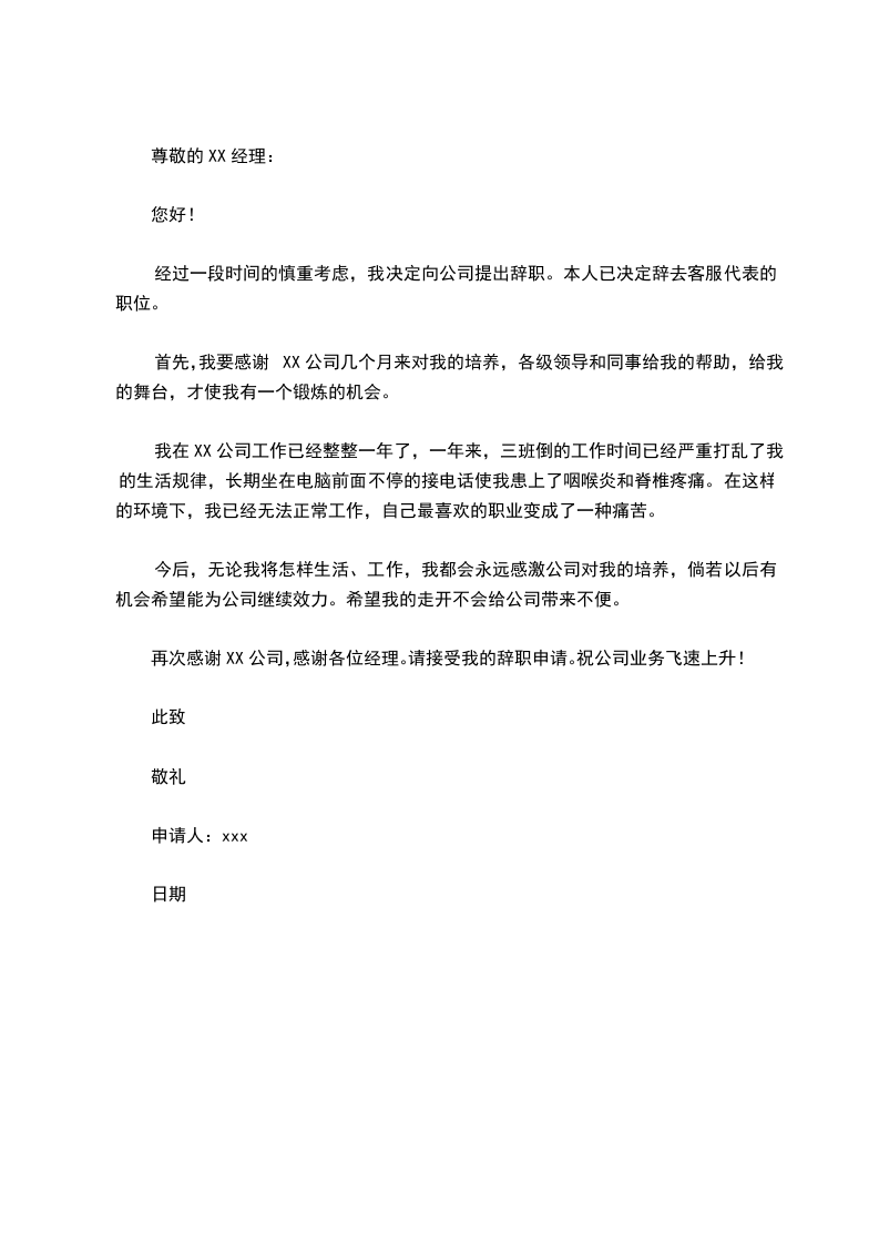 我在XX公司工作已经整整一年了,一年来,三班倒的工作时间已经严重打乱了我的生活规律,长期坐在电脑前面不停的接电话使我患上了咽喉炎和脊椎疼痛。在这样的环境下,我已经无法正常工作,自己最喜欢的职业变成了一种痛苦。