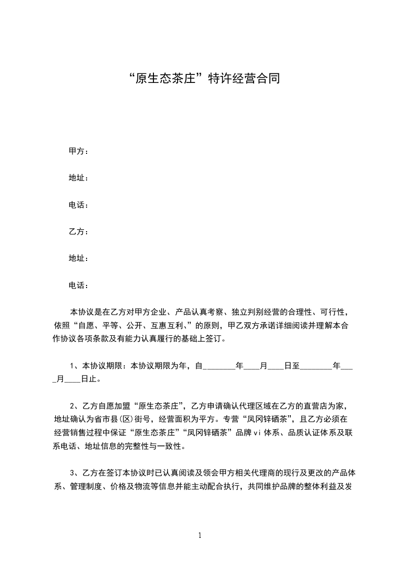 2、乙方自愿加盟“原生态茶庄”,乙方申请确认代理区域在乙方的直营店为家,地址确认为省市县(区)街号,经营面积为平方。专营“凤冈锌硒茶”,且乙方必须在经营销售过程中保证“原生态茶庄”“凤冈锌硒茶”品牌vi体系、品质认证体系及联系电话、地址信息的完整性与一致性。