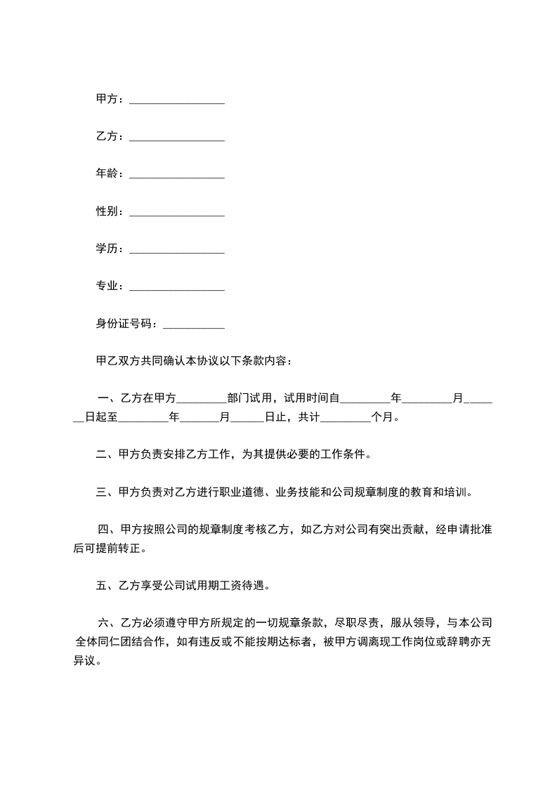 一、乙方在甲方_________部门试用,试用时间自_________年_________月_______日起至_________年_______月______日止,共计_________个月。