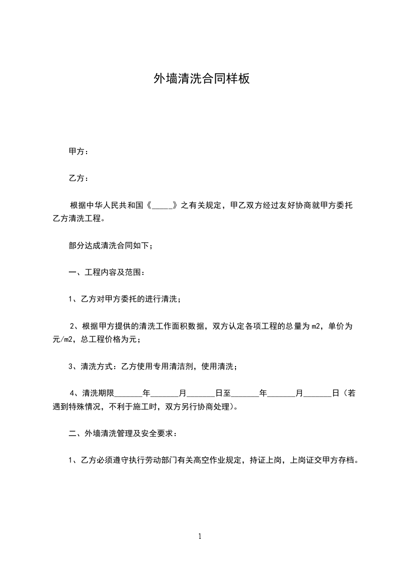 2、根据甲方提供的清洗工作面积数据,双方认定各项工程的总量为m2,单价为_____元/m2,总工程价格为_____元;