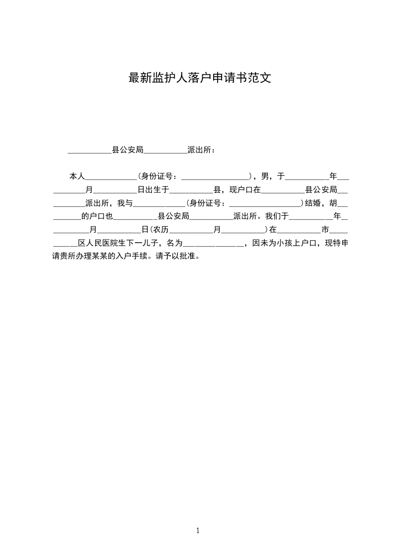 本人_____________(身份证号:_________________),男,于___________年___________月___________日出生于___________县,现户口在___________县公安局___________派出所,我与_____________(身份证号:__________________)结婚,胡__________的户口也___________县公安局___________派出所。我们于___________年___________月___________日(农历___________月___________)在___________市___________区人民医院生下一儿子,名为_______________,因未为小孩上户口,现特申请贵所办理某某的入户手续。请予以批准。