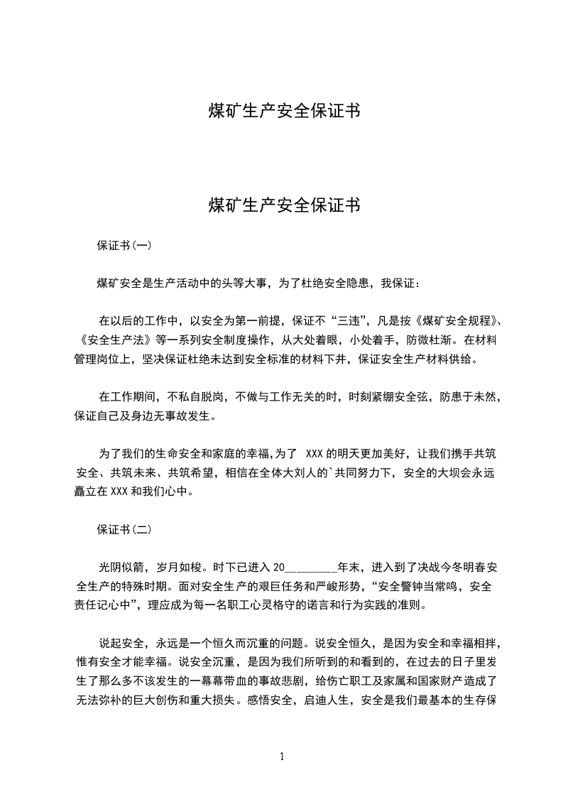 煤矿生产安全保证书