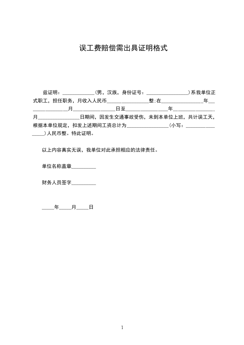 兹证明:_____________(男,汉族,身份证号:_________________)系我单位正式职工,担任职务,月收入人民币_________________整;在_________________年_________________月_________________日至_________________年_________________月_________________日期间,因发生交通事故受伤,未到本单位上班,共计误工天,根据本单位规定,扣发上述期间工资总计为_________________(小写:_________________)人民币整。特此证明。