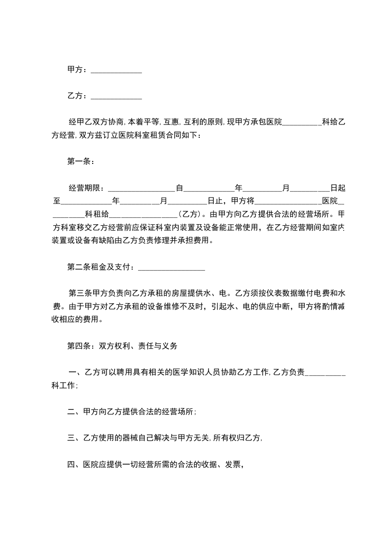 经甲乙双方协商,本着平等,互惠,互利的原则,现甲方承包医院__________科给乙方经营,双方兹订立医院科室租赁合同如下: