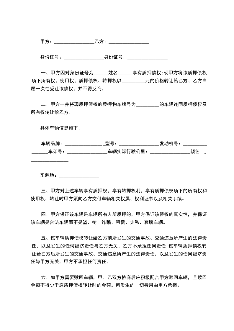 二、甲方一并将现质押债权的质押物车牌号为__________的车辆连同质押债权及所有权转让给乙方。