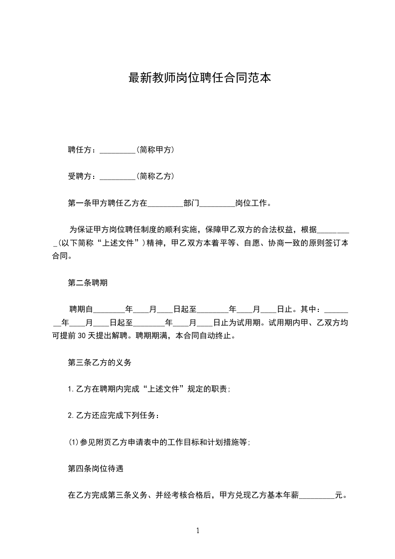 为保证甲方岗位聘任制度的顺利实施,保障甲乙双方的合法权益,根据_________(以下简称“上述文件”)精神,甲乙双方本着平等、自愿、协商一致的原则签订本合同。