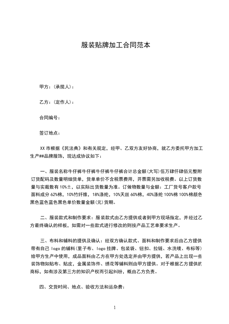XX市根据《民法典》和有关规定,经甲、乙双方友好协商,就乙方委托甲方加工生产##品牌服饰,现达成协议如下: