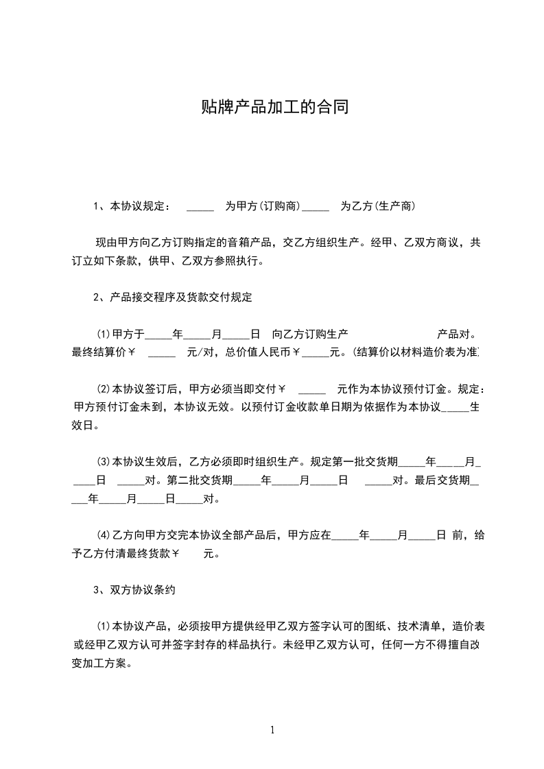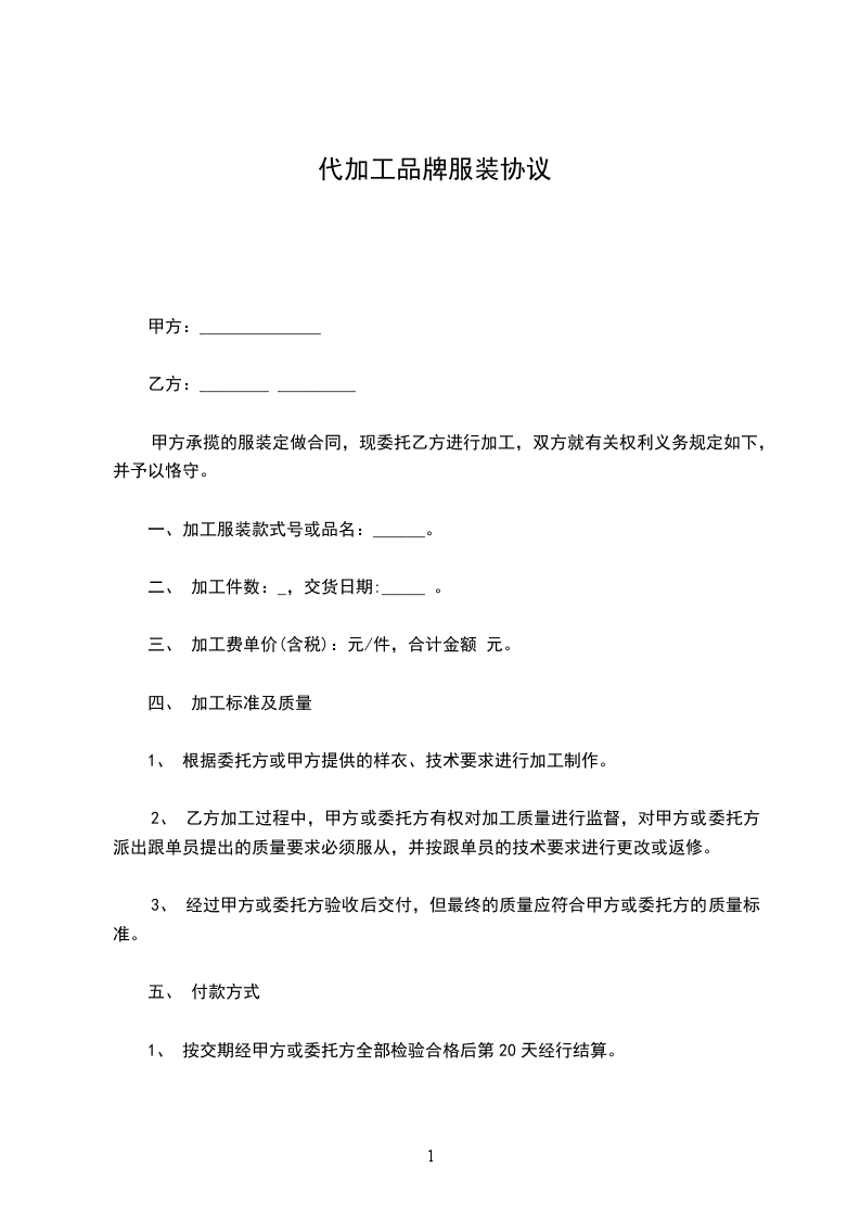 二、服装款式和制作要求:服装款式由乙方提供或者到甲方现场指定,并经过乙方最终确认的样板,如需对一些款式进行修改的则按产品工艺单要求生产。