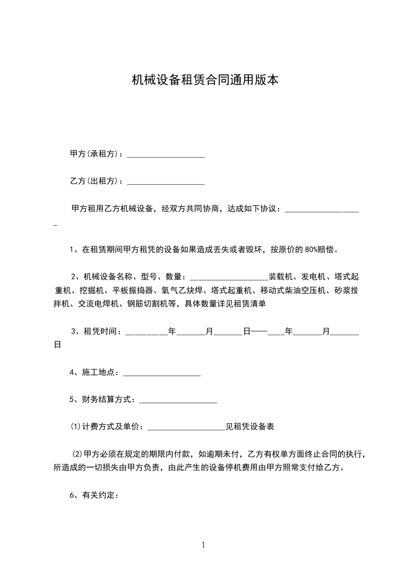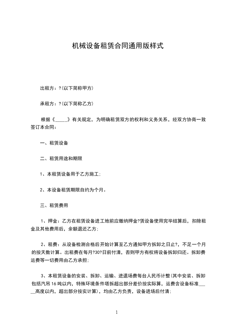 1、押金:乙方在租赁设备进工地前应缴纳押金?赁设备使用完毕结算后,扣除租金及其他费用后,余额退还乙方;