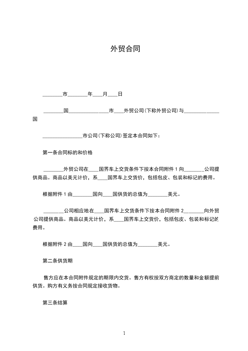 ________外贸公司在____国界车上交货条件下按本合同附件1向________公司提供商品。商品以美元计价,系____国界车上交货价,包括包皮、包装和标记的费用。