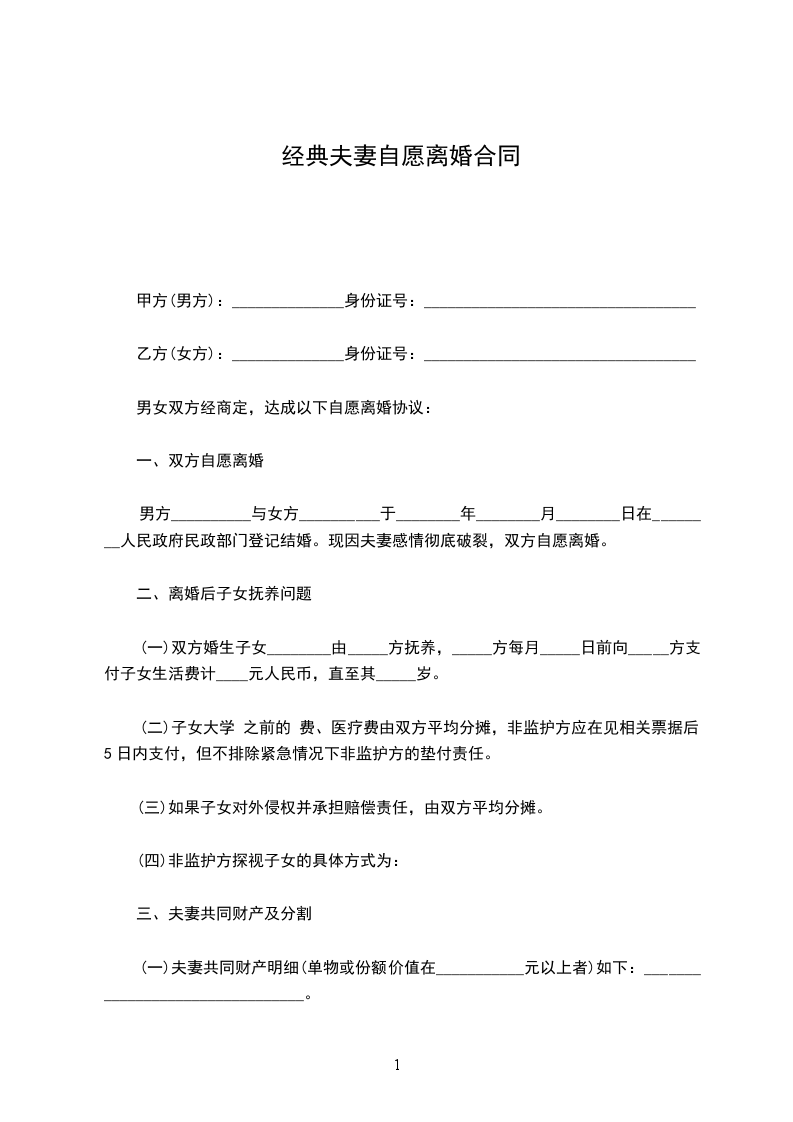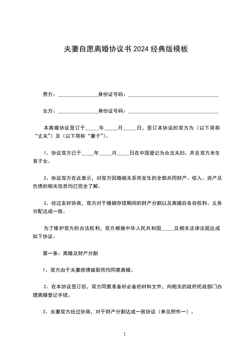 1、协议双方已于_____年_____月_____日在中国登记为合法夫妇。并且双方未生育子女。