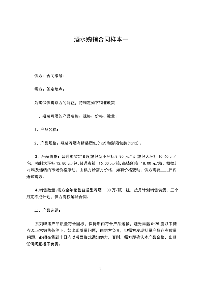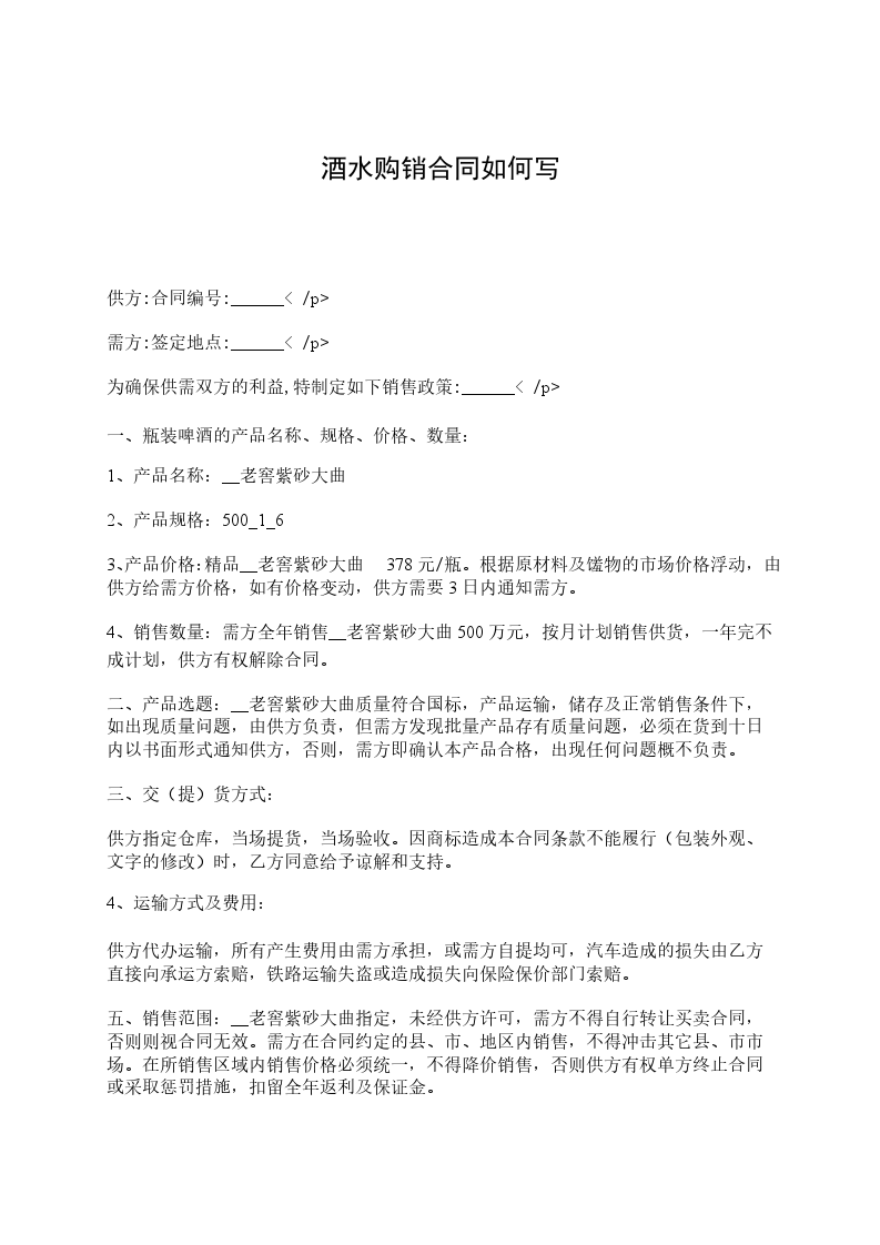 系列啤酒指定(市、区)一家总代理,未经供方许可,需方不得自行转让买卖合同,否则则视合同无效。需方在合同约定的县、市、地区内销售,不得冲击其它县、市市场。在所销售区域内销售价格必须统一,不得降价销售,否则供方有权单方终止合同或采取惩罚措施,扣留全年返利和保证金。
