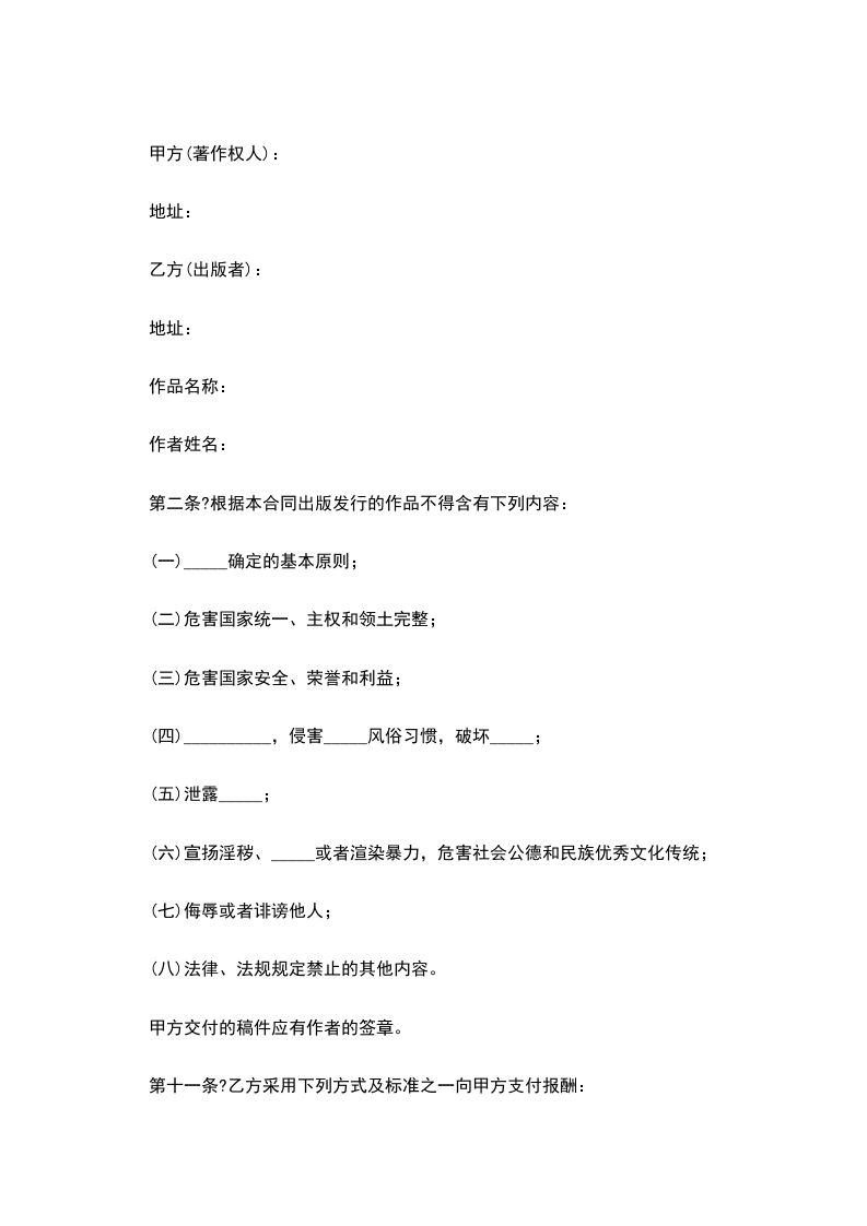 2、甲方必须保证拥有本产品中的所有内容的著作权(若为第三方授权,甲方必须向乙方提供有关授权书的复印件),若有侵犯他人著作权和专有出版权之行为,甲方应负全部责任。甲方保证该作品不含有下列内容: