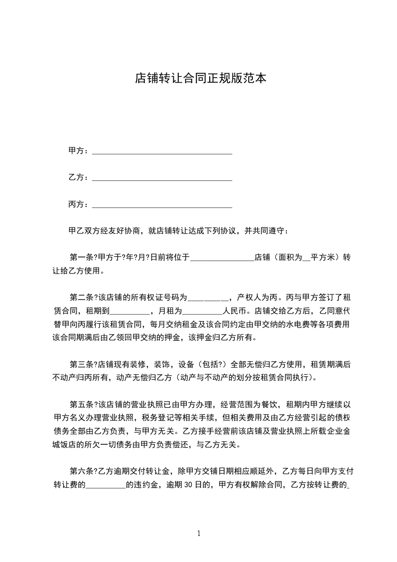 第一条?甲方于?年?月?日前将位于________________店铺(面积为__平方米)转让给乙方使用。