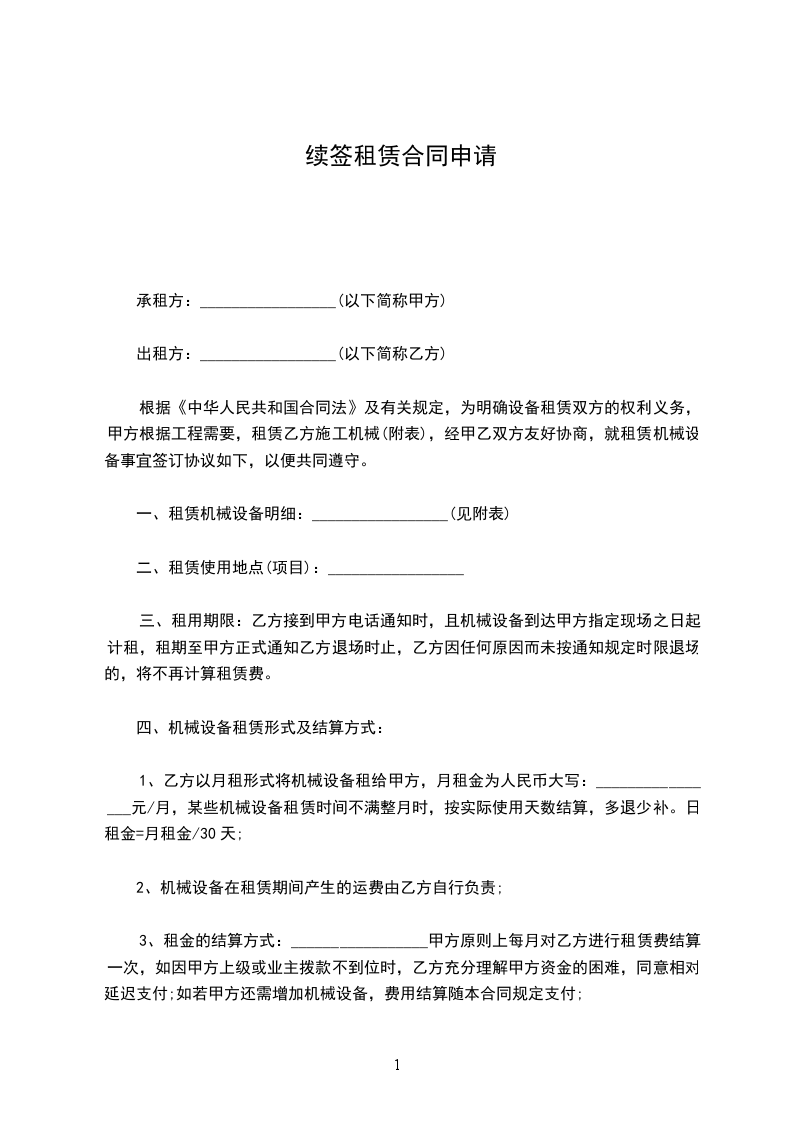 1、乙方以月租形式将机械设备租给甲方,月租金为人民币大写:________________元/月,某些机械设备租赁时间不满整月时,按实际使用天数结算,多退少补。日租金=月租金/30天;