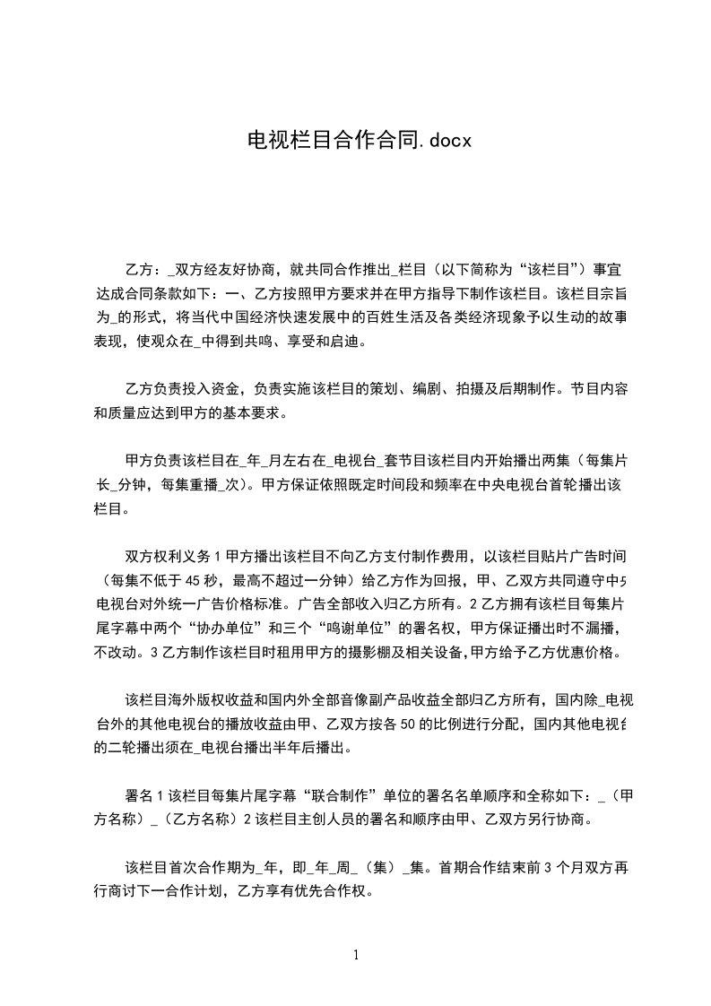 双方经友好协商,就共同合作推出大型系列室内情景栏目喜剧《_________》栏目(以下简称为“该栏目”)事宜达成合同条款如下: