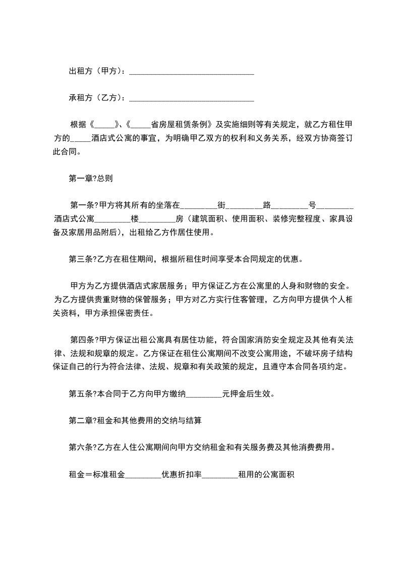 根据《_____》、《_____省房屋租赁条例》及实施细则等有关规定,就乙方租住甲方的_____酒店式公寓的事宜,为明确甲乙双方的权利和义务关系,经双方协商签订此合同。